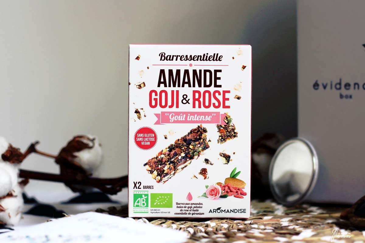 C’est donc une barre essentielle que nous retrouvons ce mois-ci qui correspond en fait à une barre de fruits secs, sans gluten, sans lactose et vegan. Les saveurs sont très originales et particulières avec les notes fleuries de la Rose, accompagnées par des baies de Goji séchées, l’ensemble étant enrobé d’un croustillant d’amande.