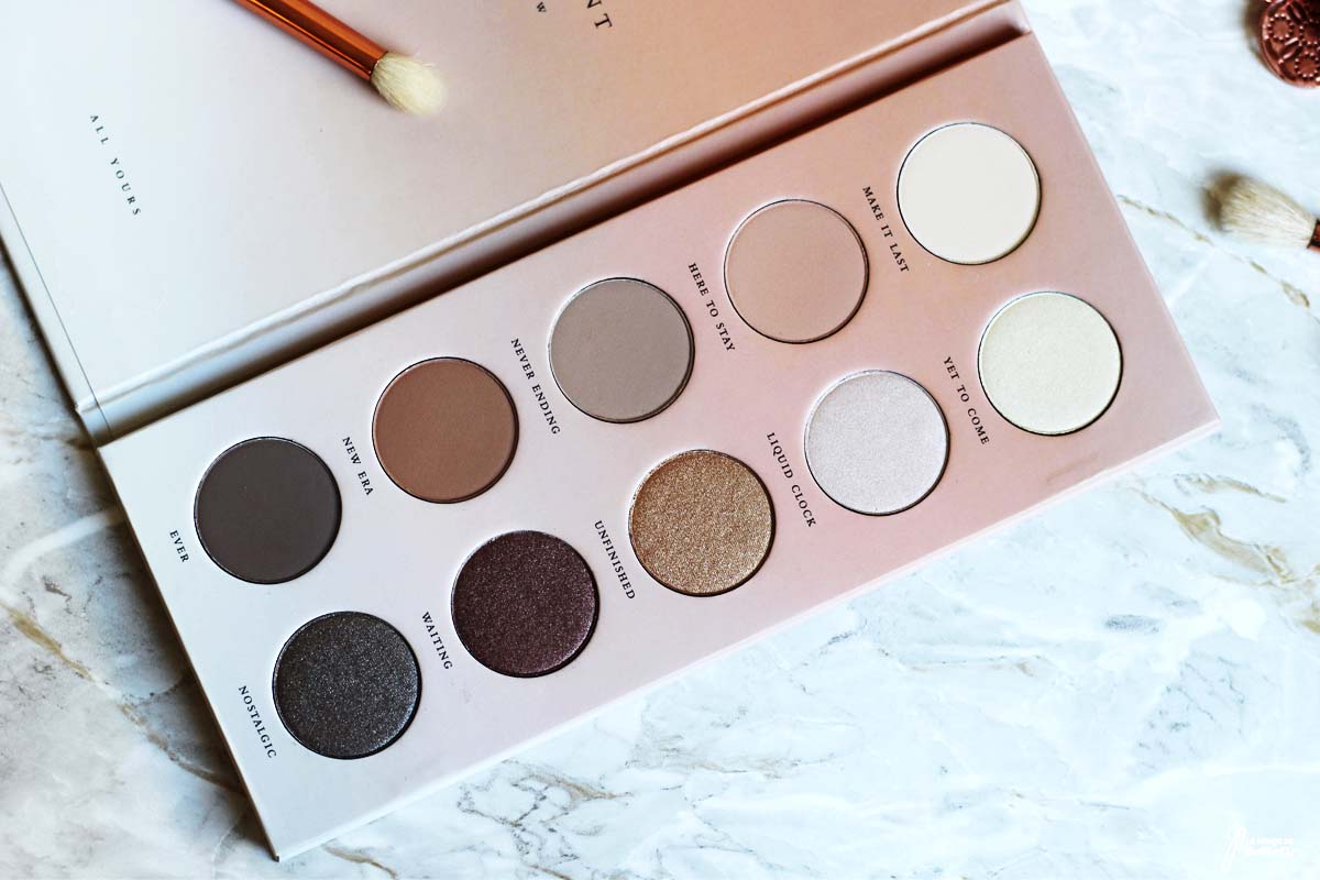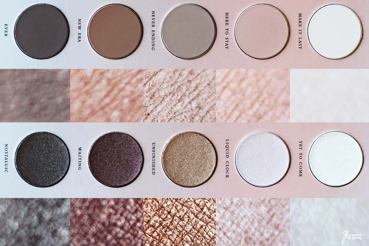 Côté packaging, on reste dans la lignée des autres palettes de la marque : un écrin cartonné de couleur rose chair, tapissé d’une horloge, faisant référence aux différents moments de la vie, entourant le nom de la palette. C’est simple, sobre, minimaliste, mais très joli. Ultra compact, cet étui n’encombrera pas vos placards déjà plein de palettes 😉 .