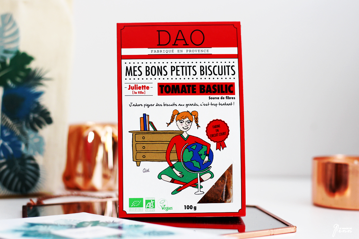 Ce mois-ci, l’équipe a pensé à nos longues soirées d’été et les apéros qui les accompagnent avec des petits biscuits salés de la marque DAO totalement inconnu au bataillon. J’ai reçu tomate-basilic et j’en suis ravie je déteste l’olive. Il n’en reste plus de toute façon !!