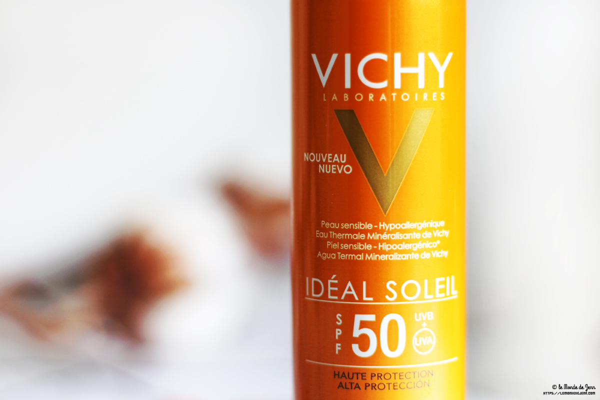 Ideal Soleil de Vichy est une brume fraîcheur solaire, haute protection avec un SPF 50, destinée à protéger contre les UVB, les UVA et les UVA longs. Elle est particulièrement adaptée au milieu citadin et s’utilise à tout moment de la journée, comme une brume classique, puisqu’elle a une texture invisible, aérienne, au fini sec, non collant et non gras. Elle peut être appliquée par-dessus la peau nue ou maquillée. La peau est ainsi rafraîchie et protéger.