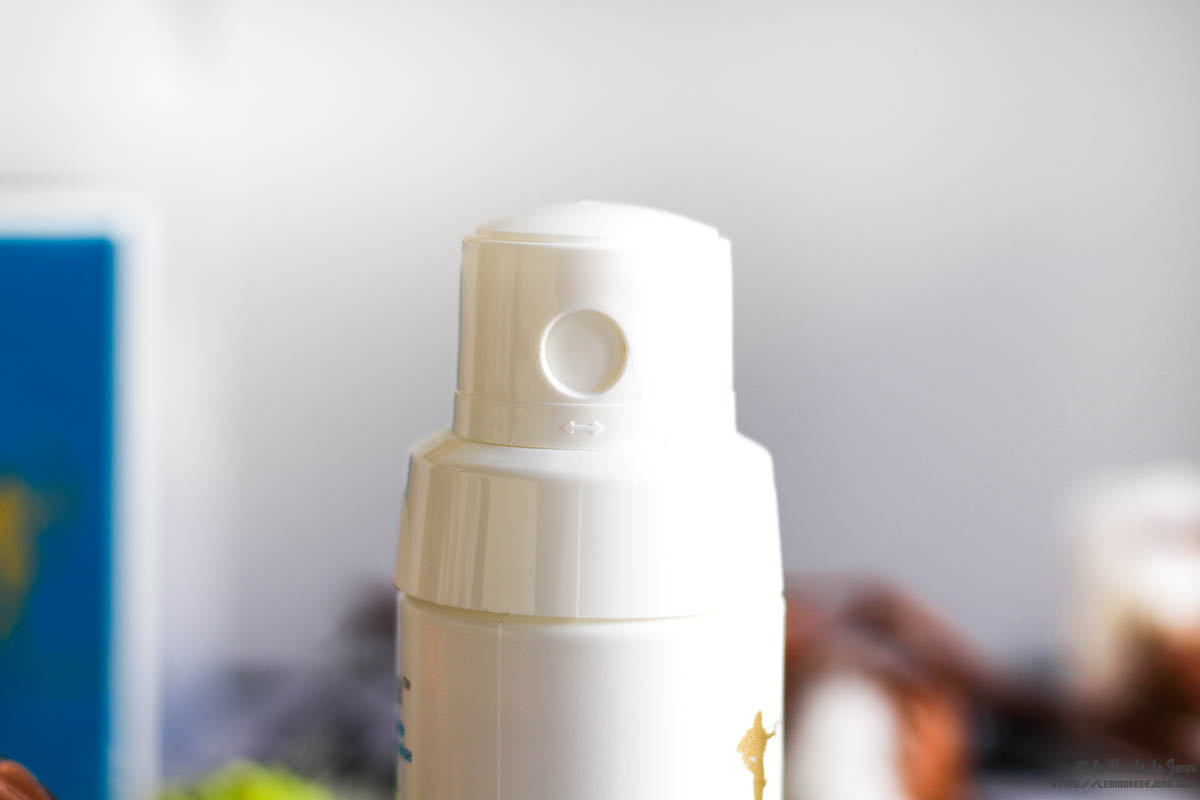 Le packaging de ce produit est des plus simple, un flacon dont il faut tourner le « capot » pour ouvrir le dispenseur. C’est pratique mais pas toujours facile à ouvrir. Parfois, lorsqu’on tourne, ça dévisse tout et enlève le bouchon. Au final, je le laisse ouvert.