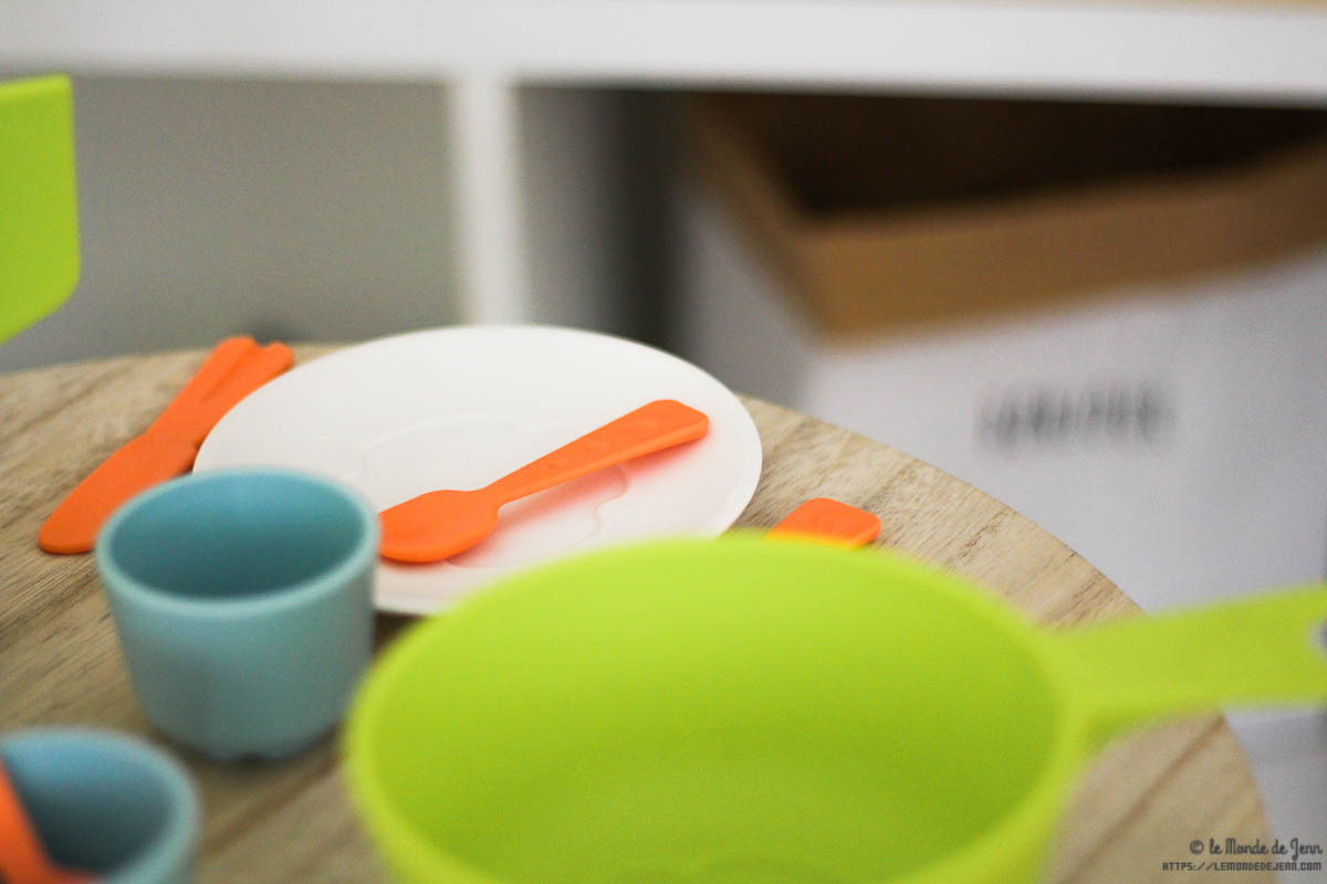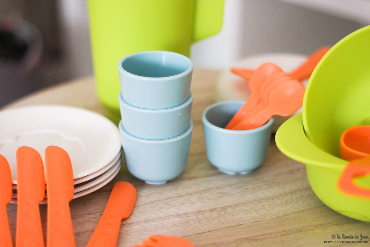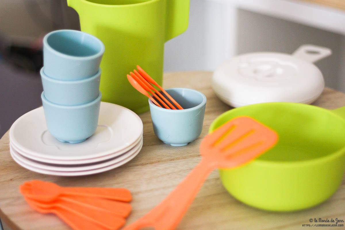 Toute la dînette dispose de couleur très vive, flashy et neutre : orange pour les couverts, vert pour les ustensiles (pichet, fait-tout, casserole), blanc pour la poêle et les assiettes et bleu pour les verres. Ces coloris permettent à l’enfant de bien discerner les différents éléments sur la table et puis ça aide à remettre vite la main dessus quand on les a égarés #çasentlevécu. Cette panoplie est haute en couleur et en qualité.
