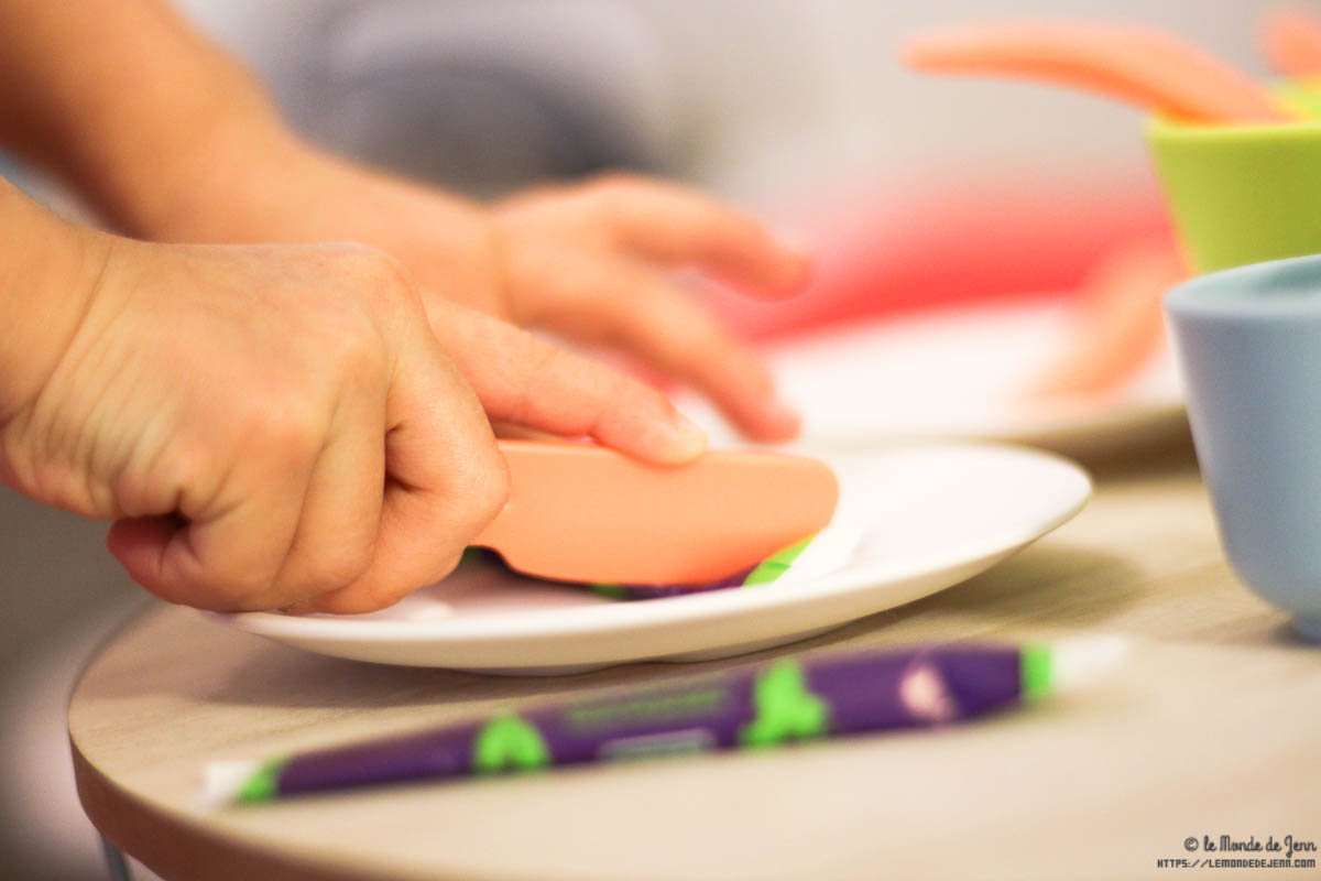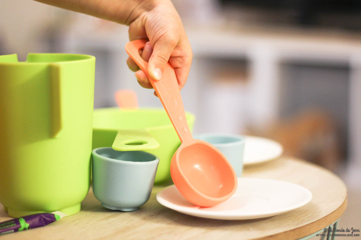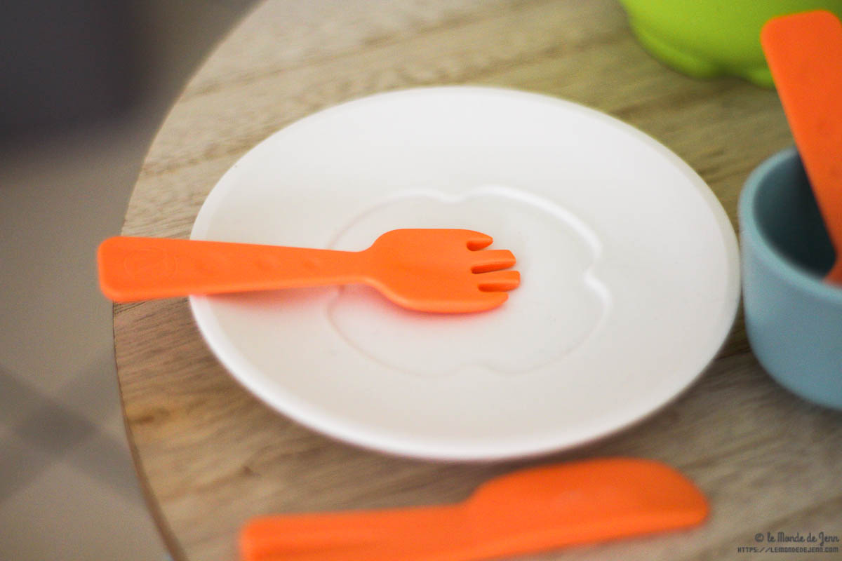 Ma poupette a rapidement apprécié les ustensiles qui sont de taille bien plus normale, crédible et adaptée à des enfants que ce qu’elle avait déjà. Les dînettes sont souvent très petits et minuscules, elles font très « jouets ». Alors que là, déjà juste de par ces couleurs, ce service fait plus « comme les grands ».