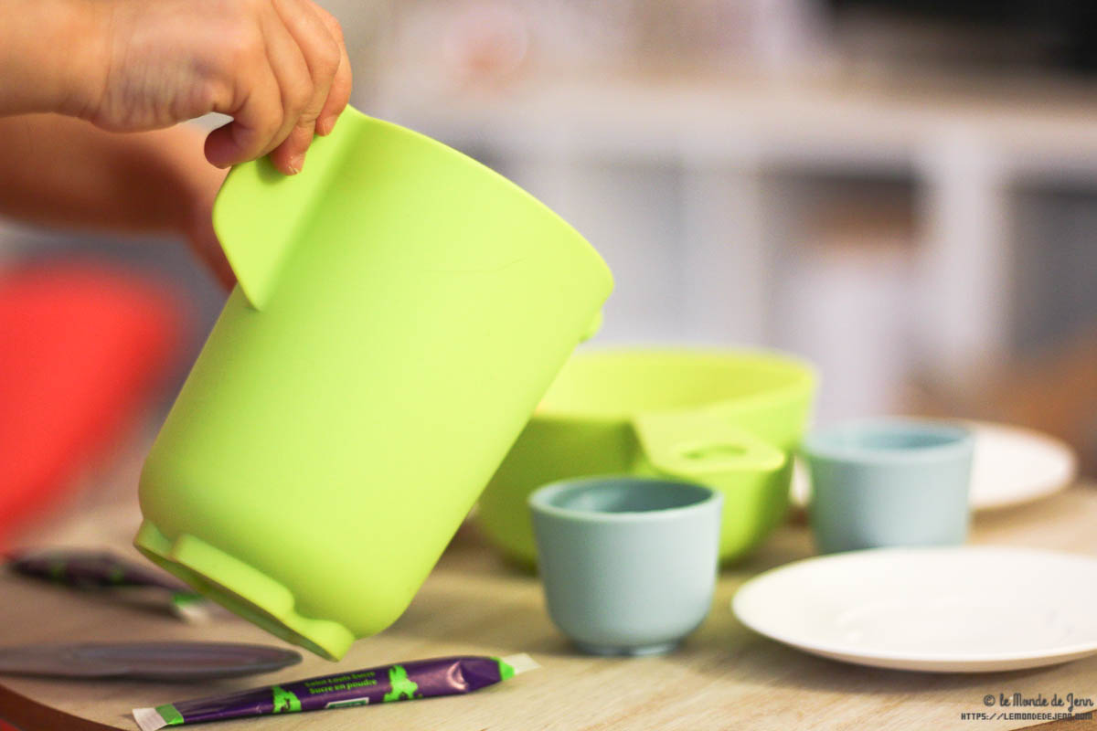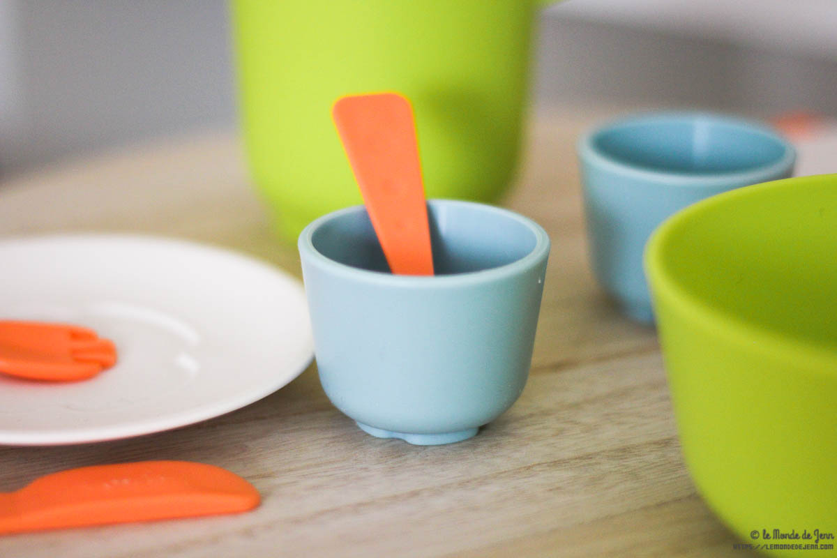Le plastique du service (POLYPROPYLÈNE régénéré) est 100% recyclé, 100% recyclable et est bien plus épais que toutes les dînettes que j’ai pu croiser dans ma vie d’ancienne petite fille, de tata, marraine ou maman. C’est du solide, qui passe même au lave-vaisselle ou « lave-maman » !