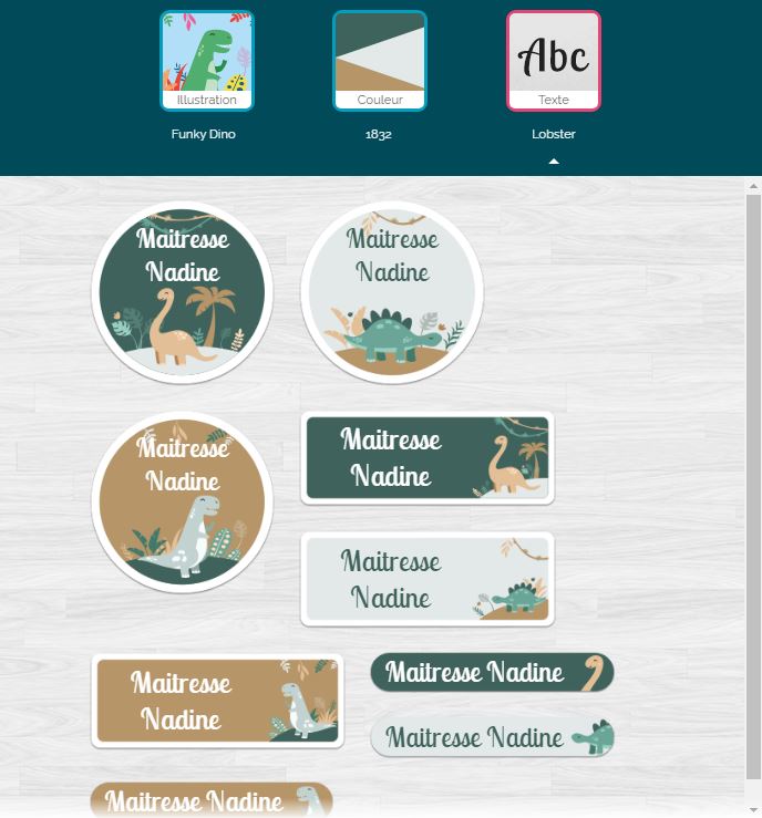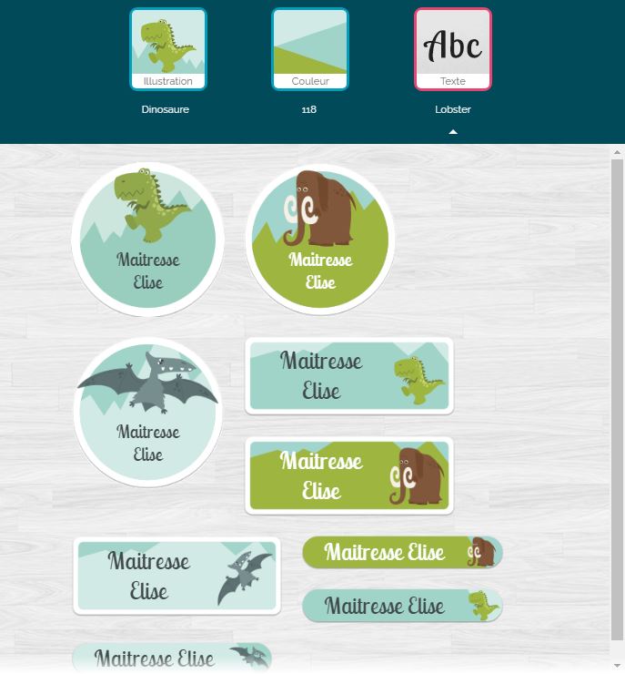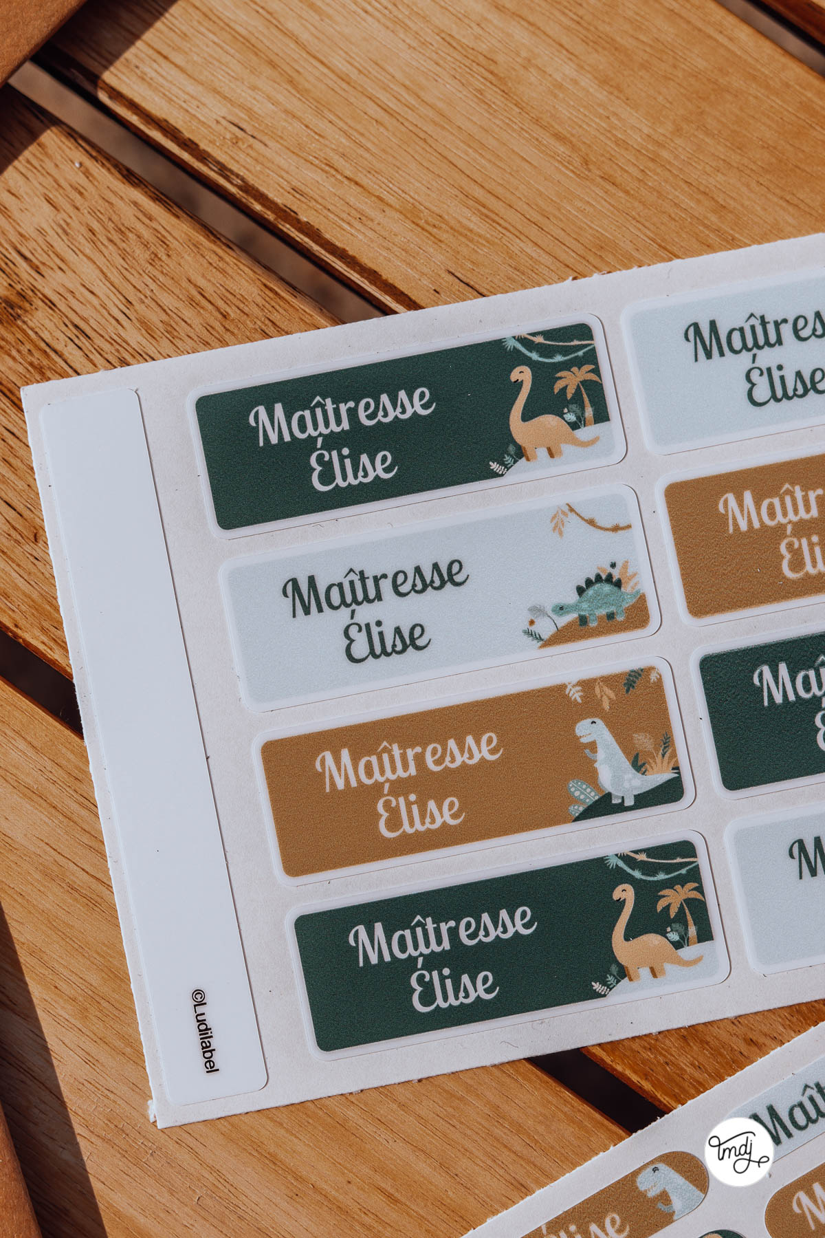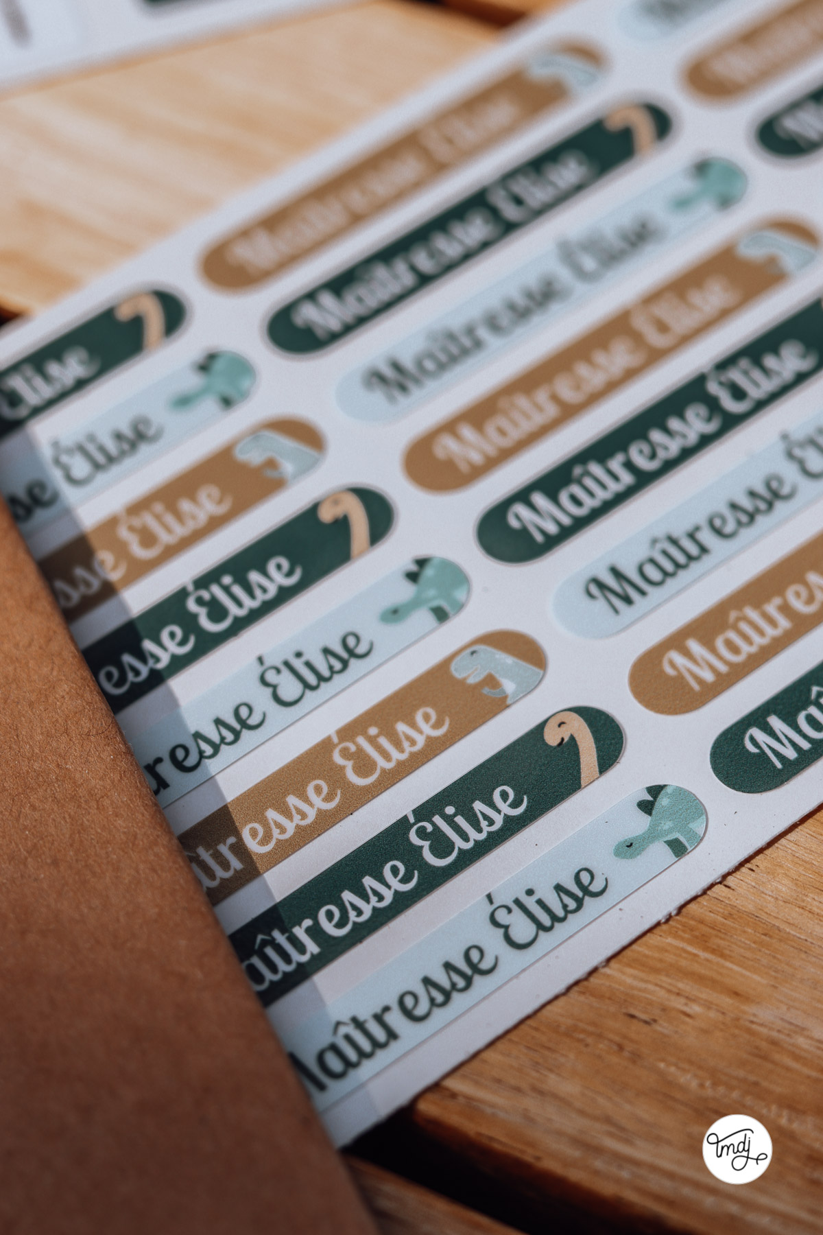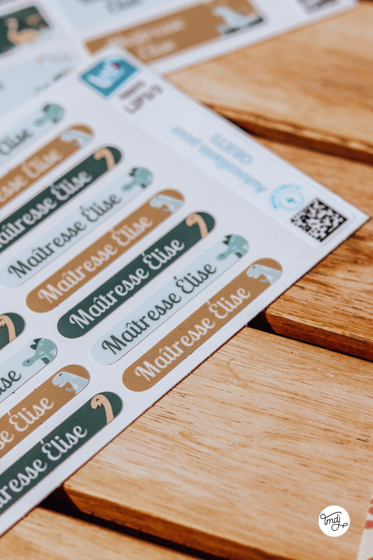 Comme vous pouvez le voir, j’ai choisi des illustrations dinosaures pour les maitresses de mon fils. Il existe plusieurs dessins sur ce thème ce qui me permet de bien différencier les modèles. Ainsi, quand elles colleront les étiquettes sur leurs affaires, ça leur rappellera la passion débordante de mon fils pour ces géants.