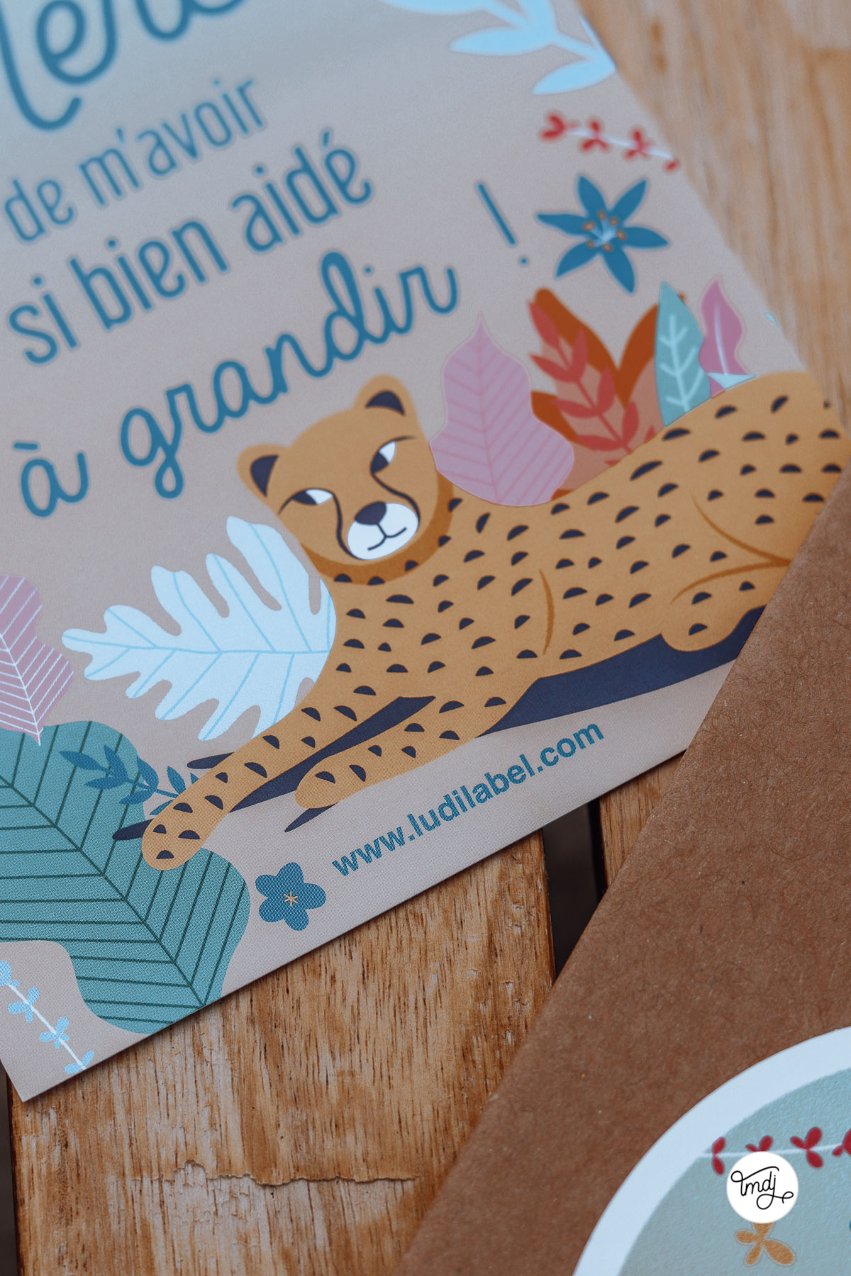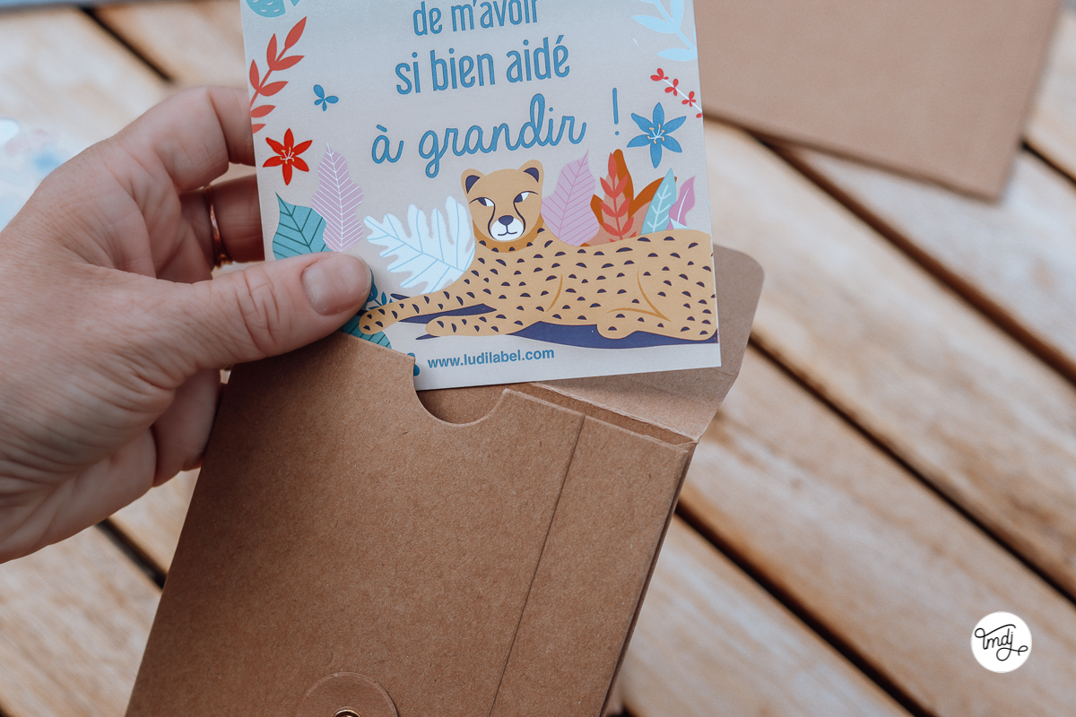 Il est vrai qu’en temps normal, nous fabriquons nous-mêmes ces cadeaux, mais là, clairement, je manque de temps ; et j’ai vu que Ludilabel proposait des pochettes-cadeaux toutes prêtes d’étiquettes autocollantes personnalisables. Le cadeau parfait : joli et pratique, qu’on peut personnaliser pour qu’il rappelle l’enfant.