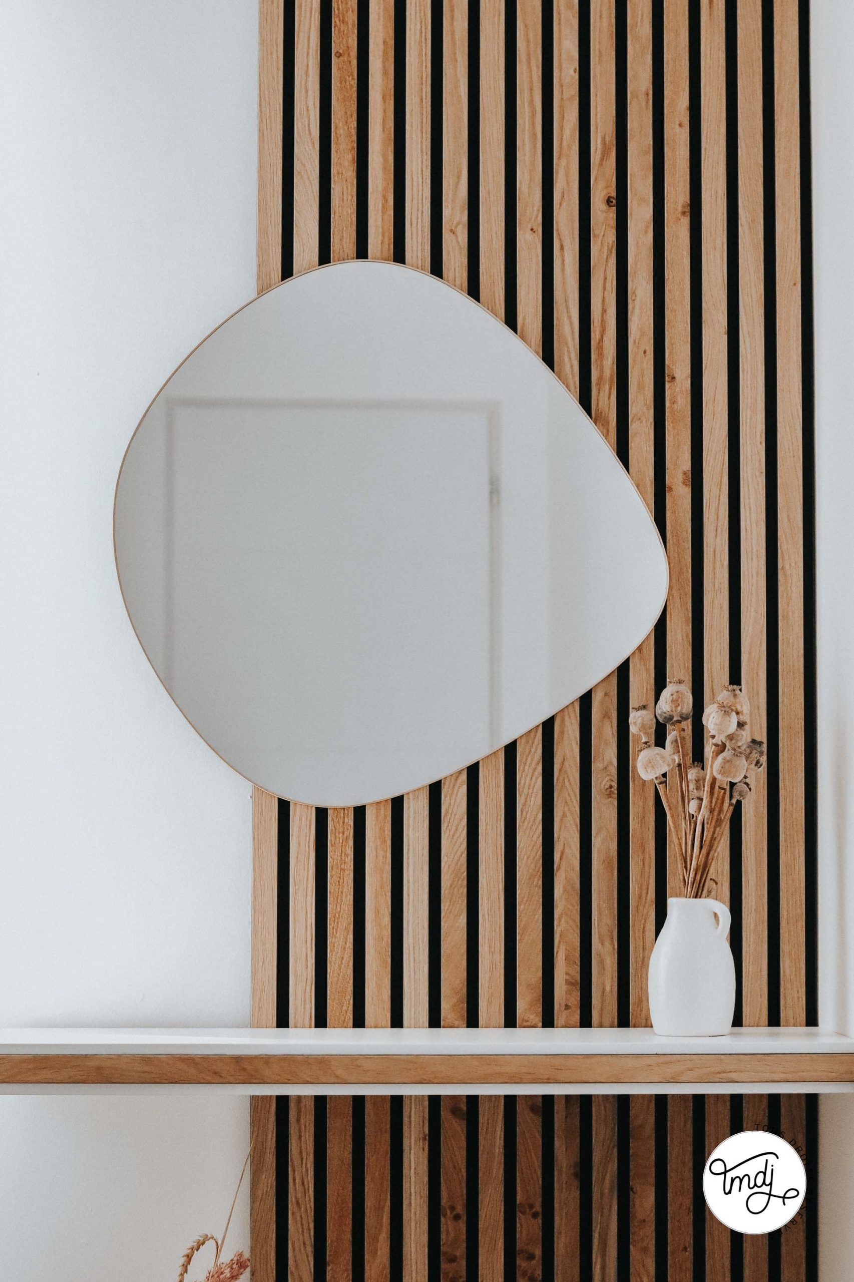 SUR LE MUR, DERRIÈRE LE MIROIR : Panneaux en tasseaux WoodUpp – coloris : Chêne Naturel Rustique