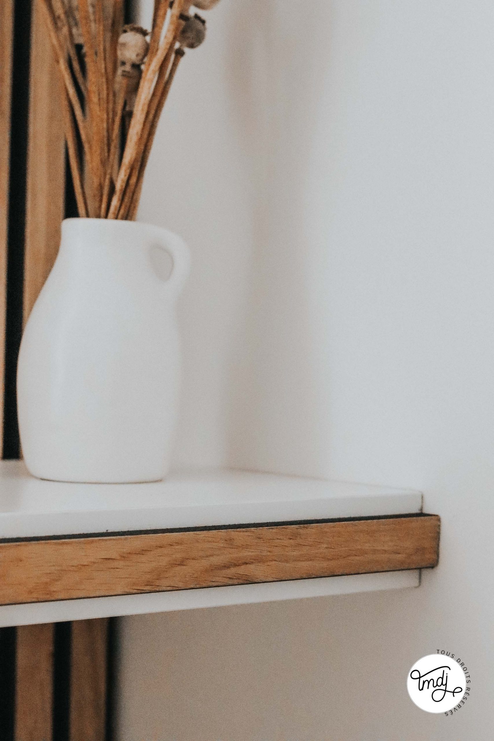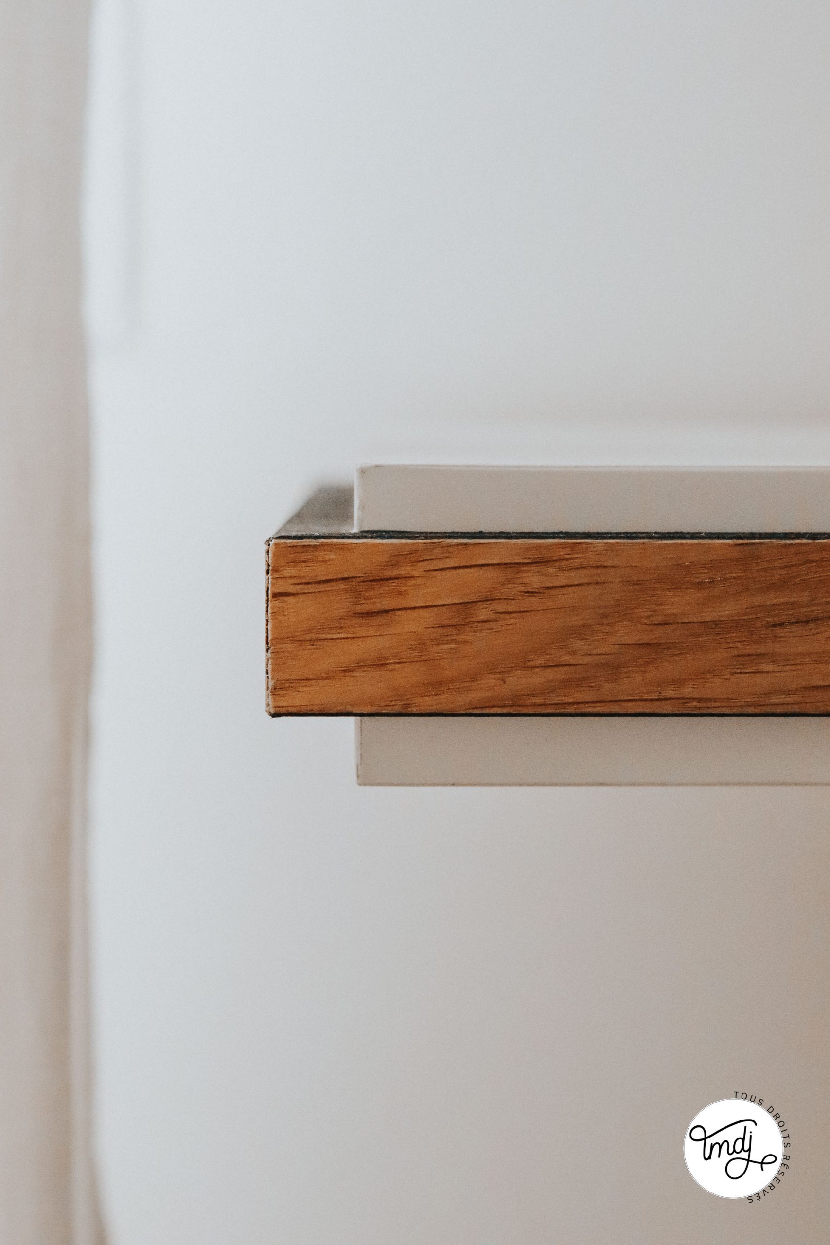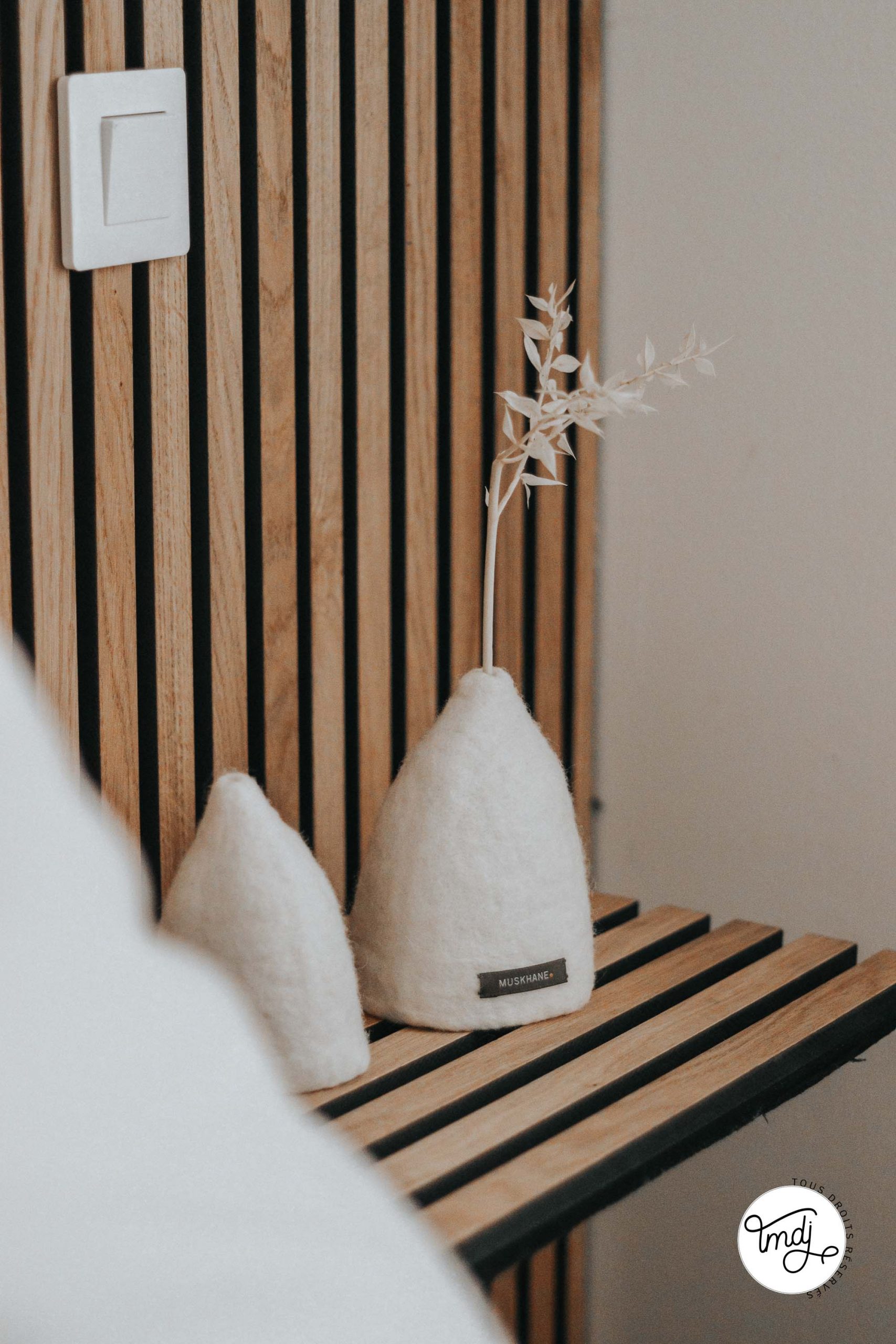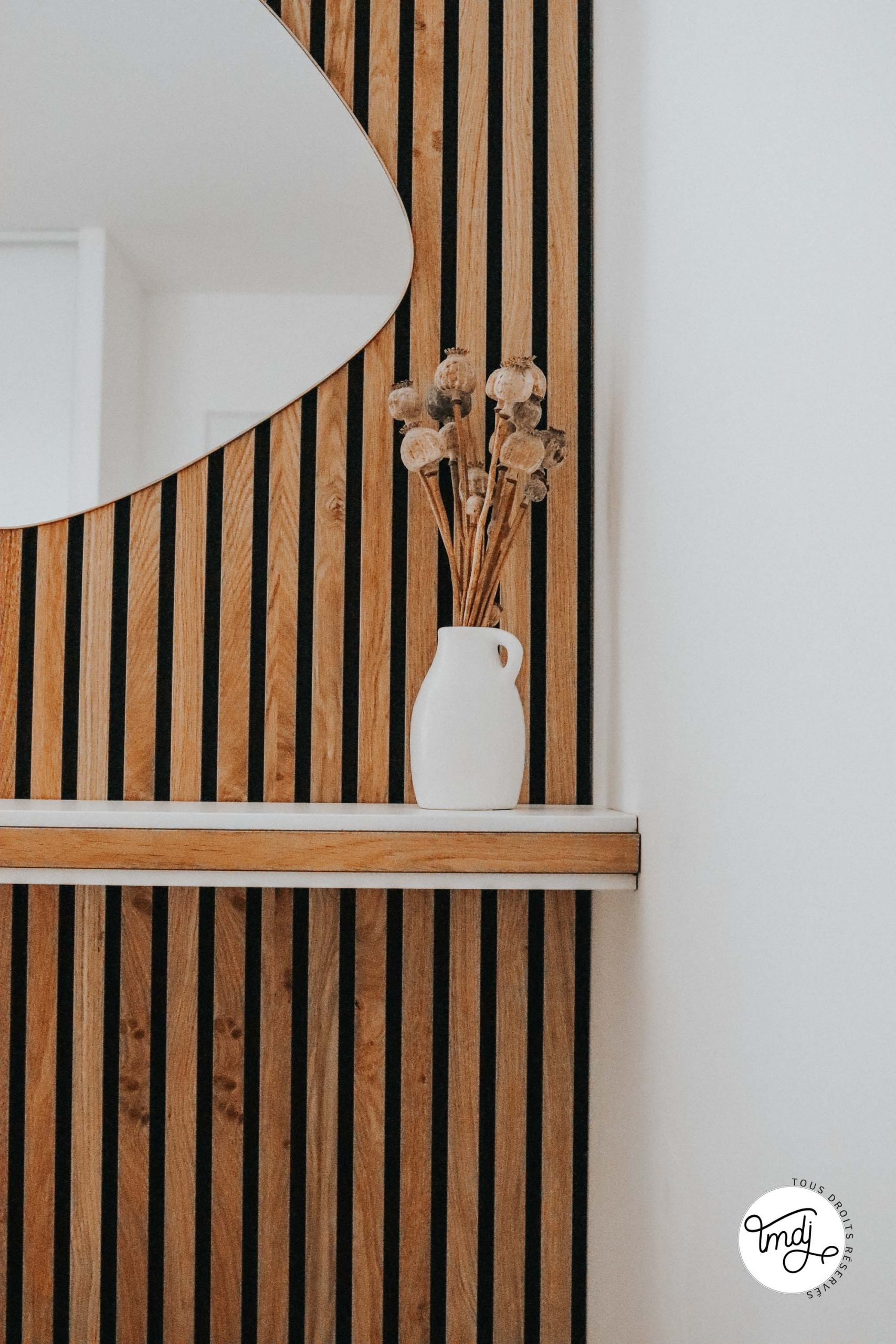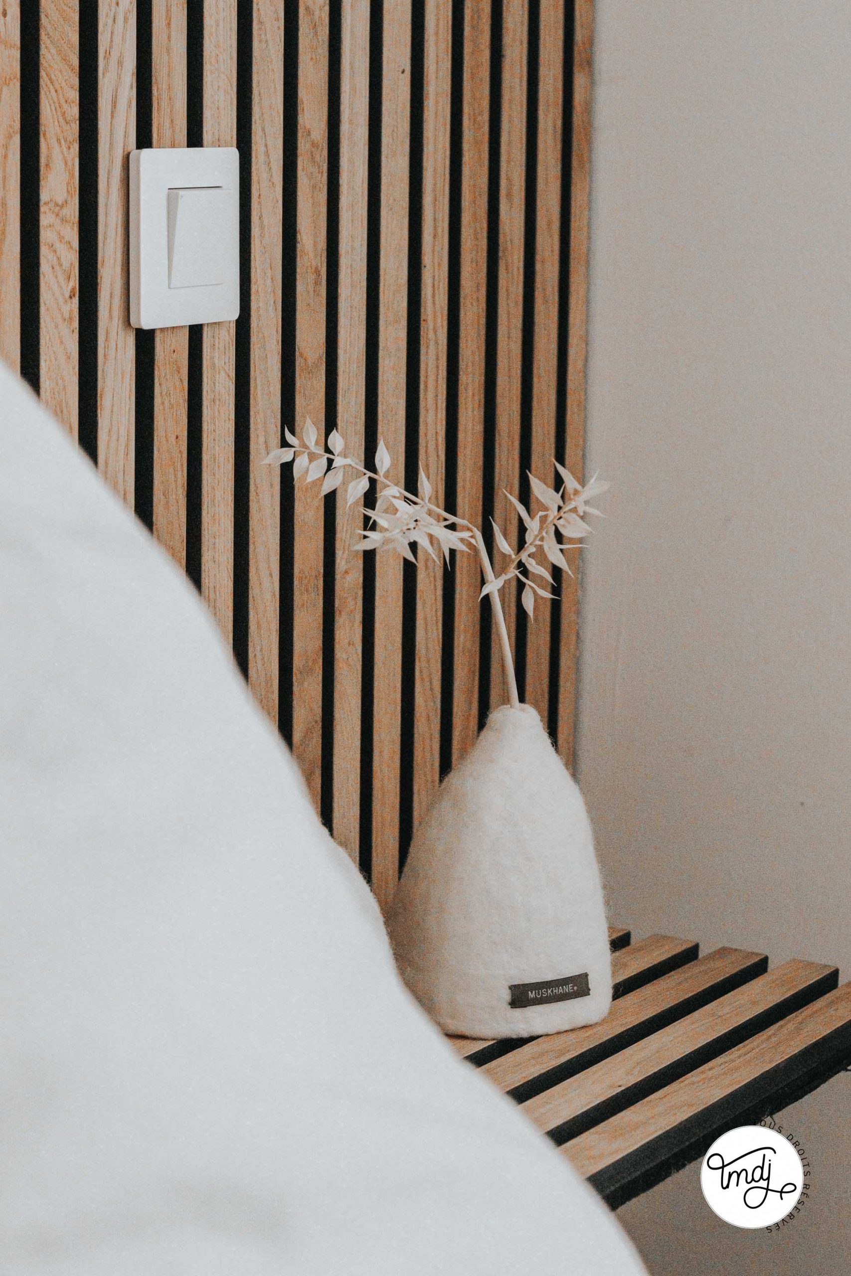 SUR LE MUR, DERRIÈRE LE LIT : Panneaux en tasseaux WoodUpp – coloris : Chêne Naturel Rustique (nous avons découpé les tasseaux pour créer le demi-mur et ajouter une baguette de finition sur le dessus)