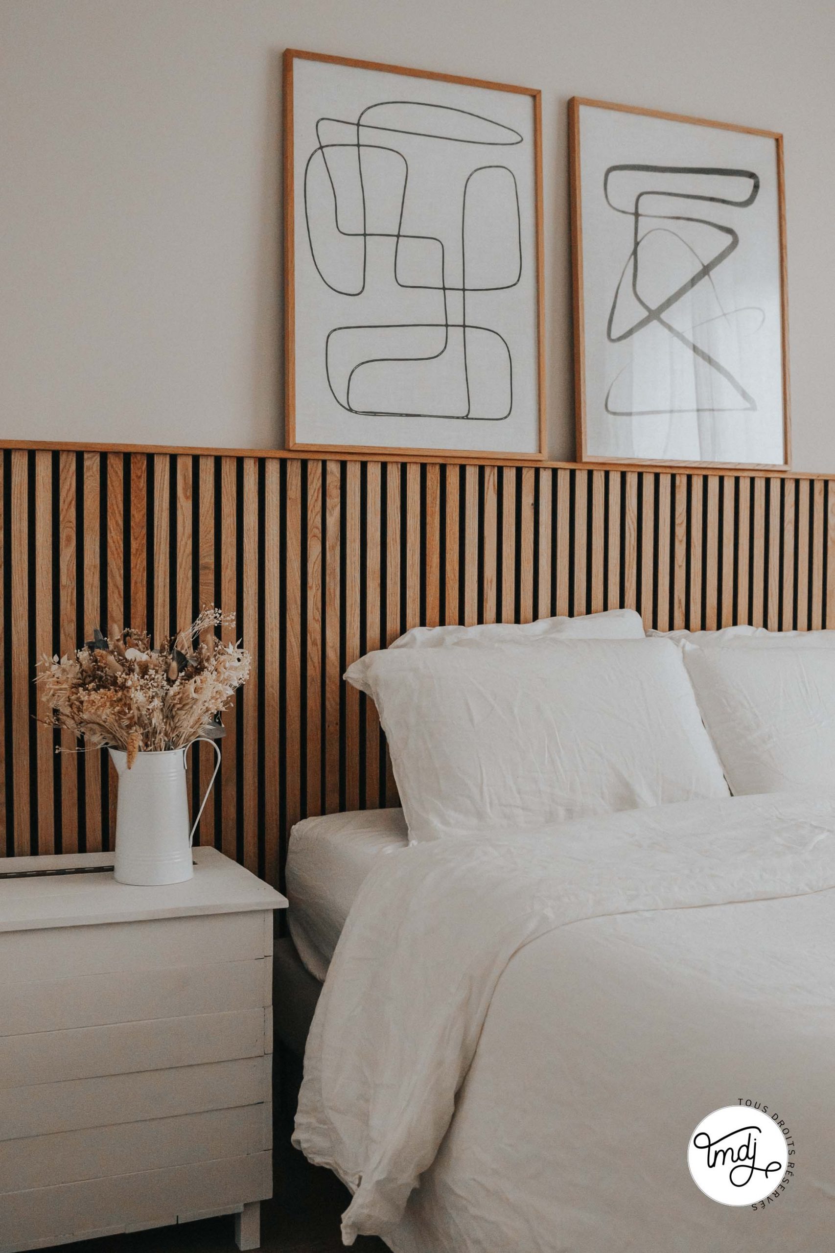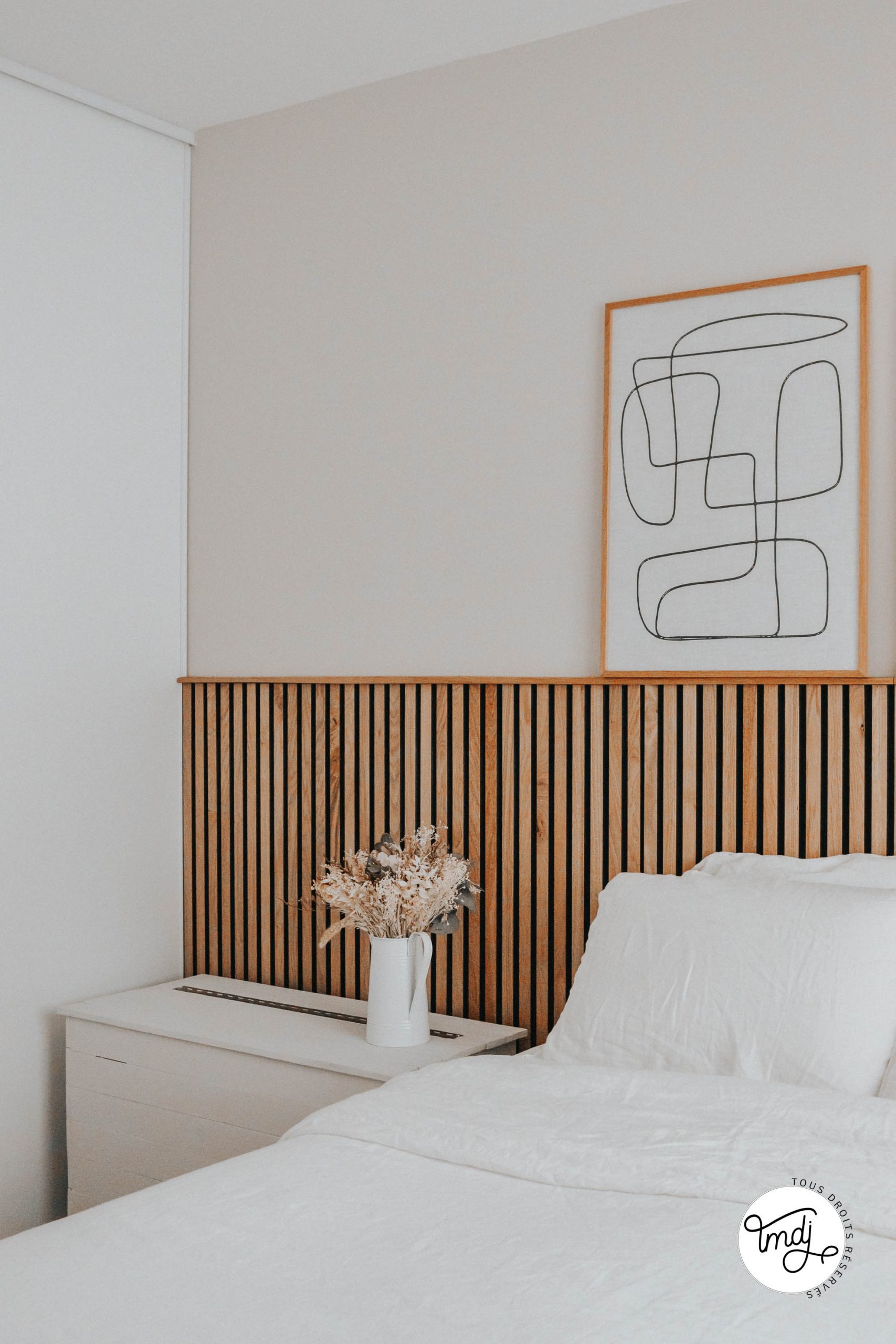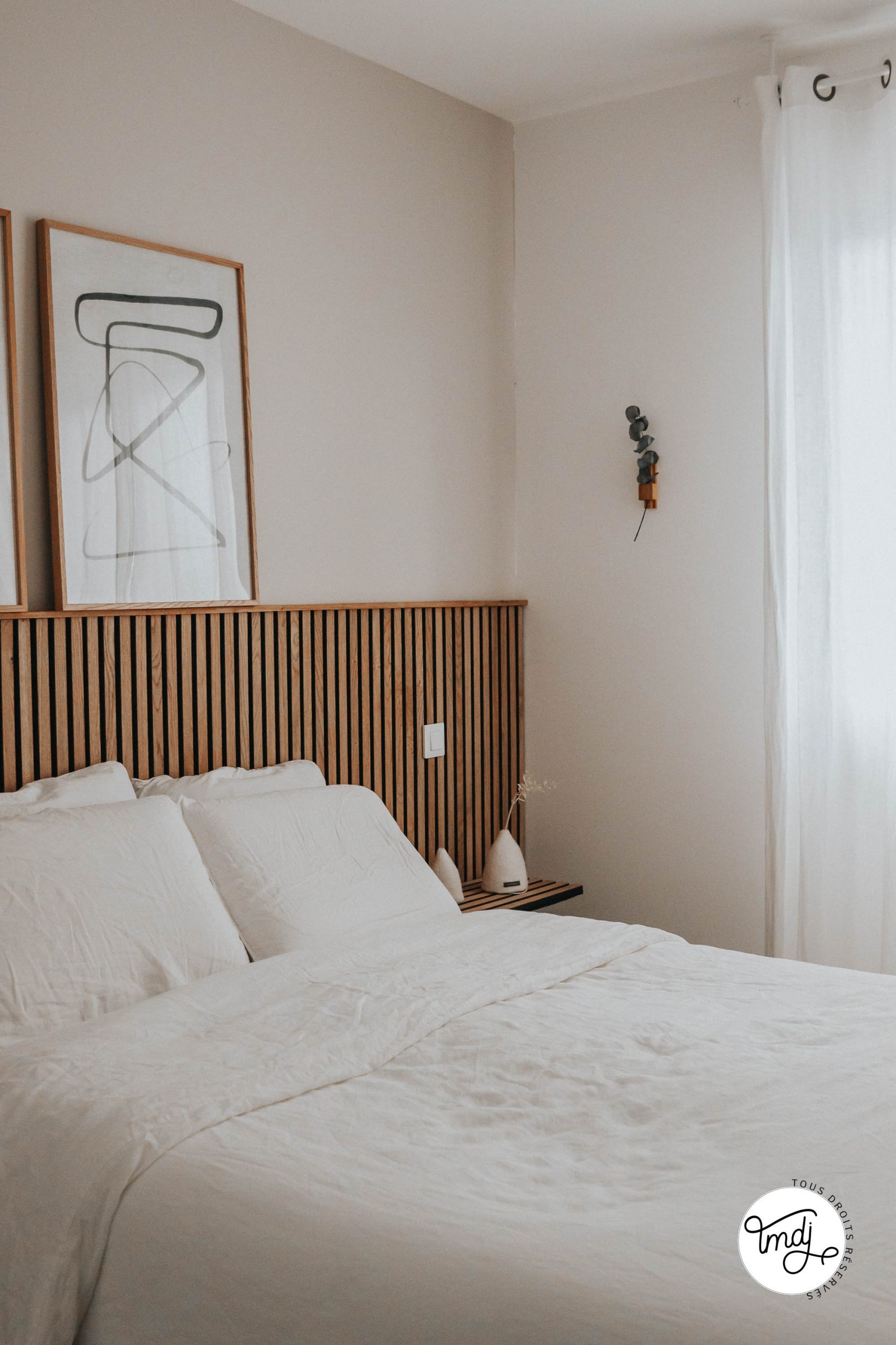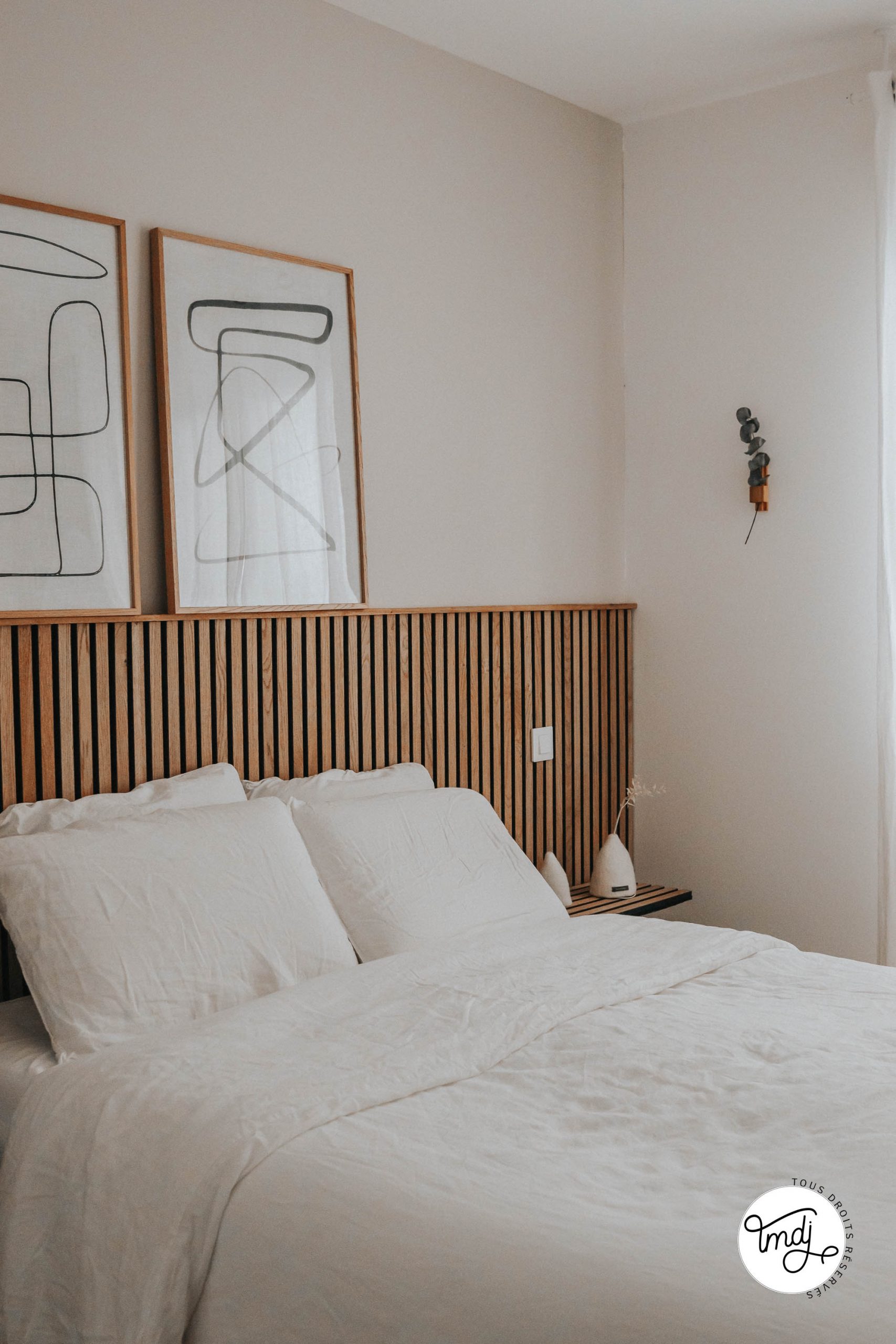 Produits offerts par la marque / Peinture IdParisDeco : Peinture ECO RESPECTUEUSE teinte : Craie – Produits offerts par la marque // LITERIE : L’incroyable Matelas Pelote Tediber / Sommier Tediber / Linge de lit Tediber // DÉCORATION : sur la table de chevet en tasseaux WoodUpp ⇒ cache-vases clochettes Muskane / Affiches Dear Sam : Soft Lines & Soft Lines 2 Produits offerts par la marque
