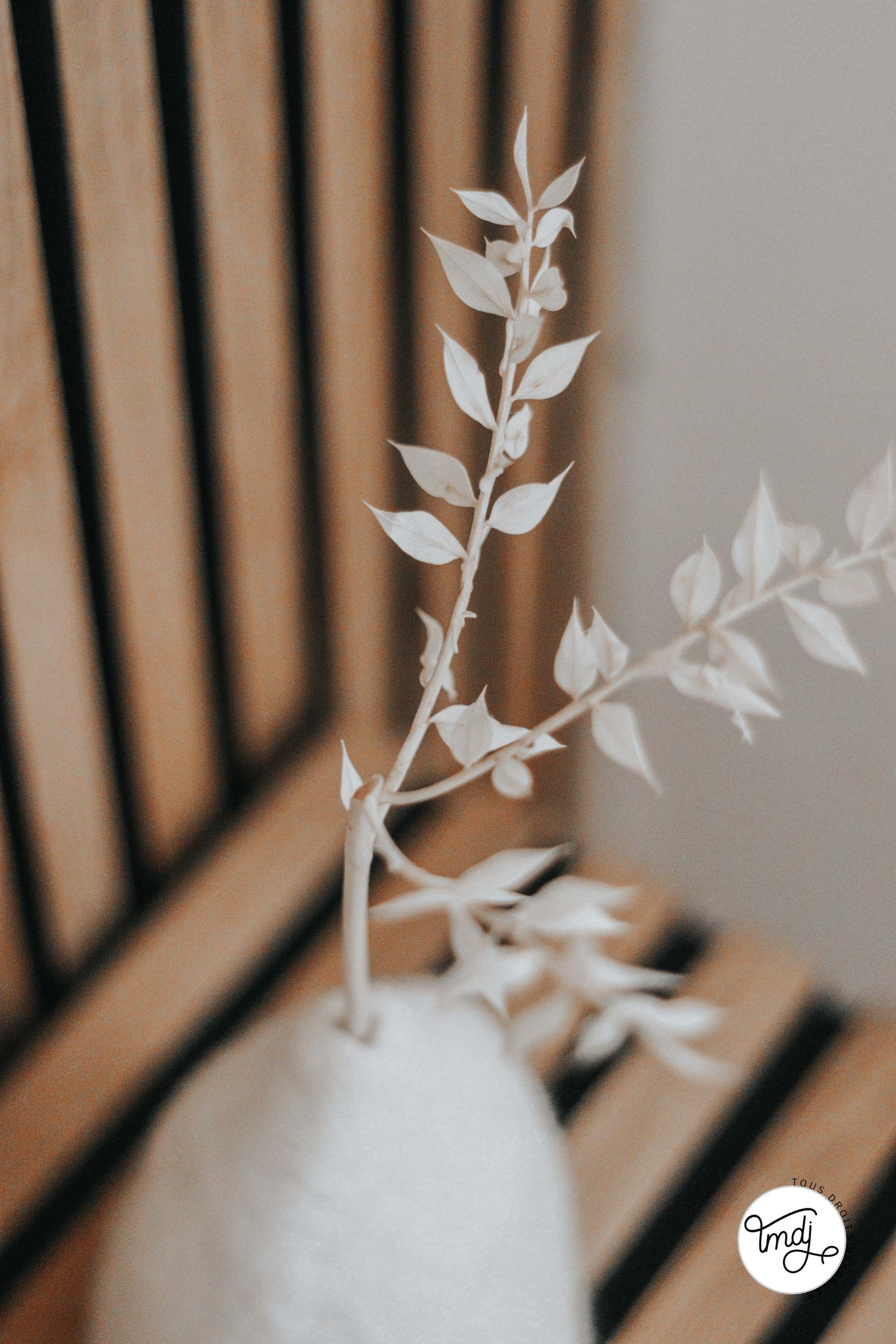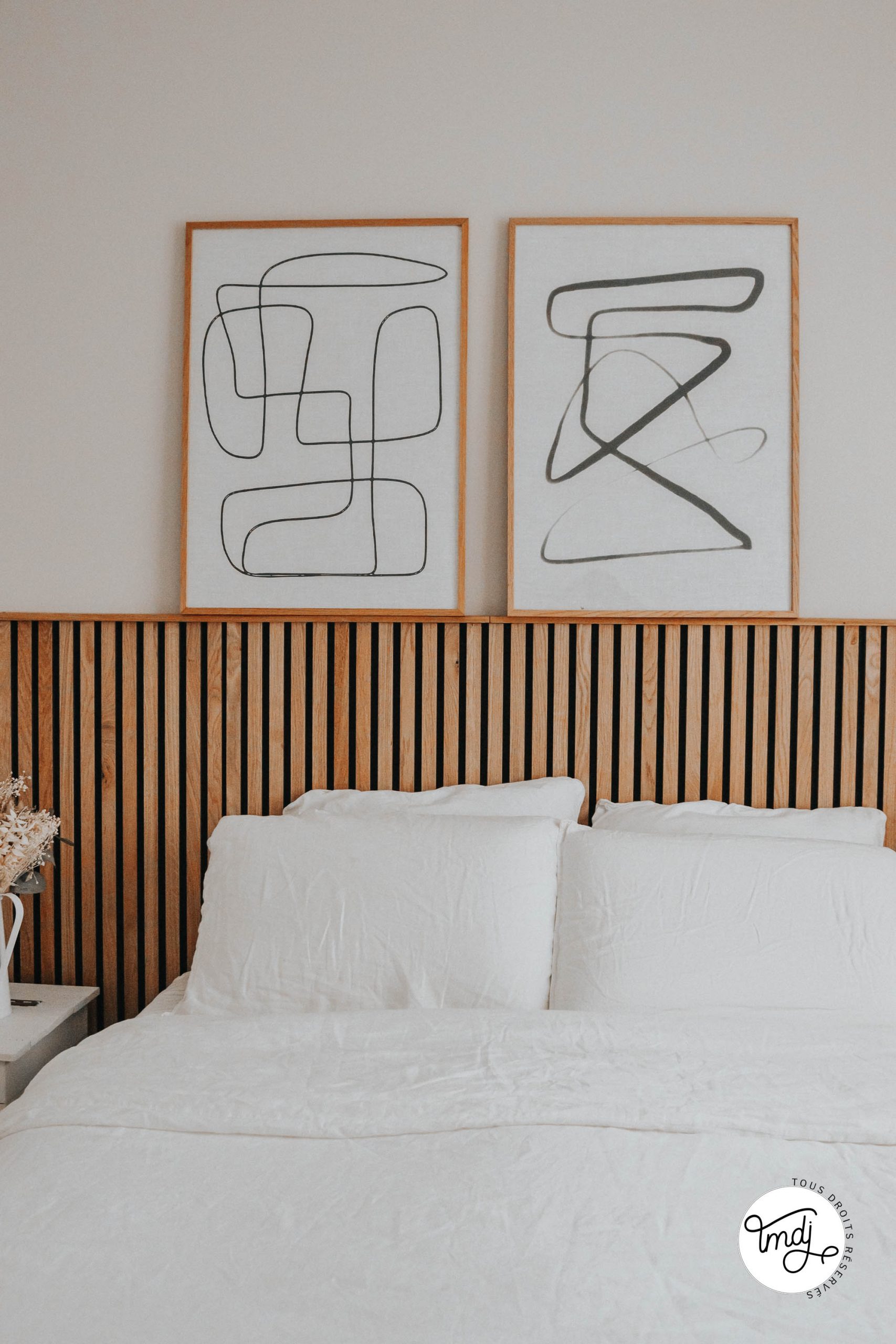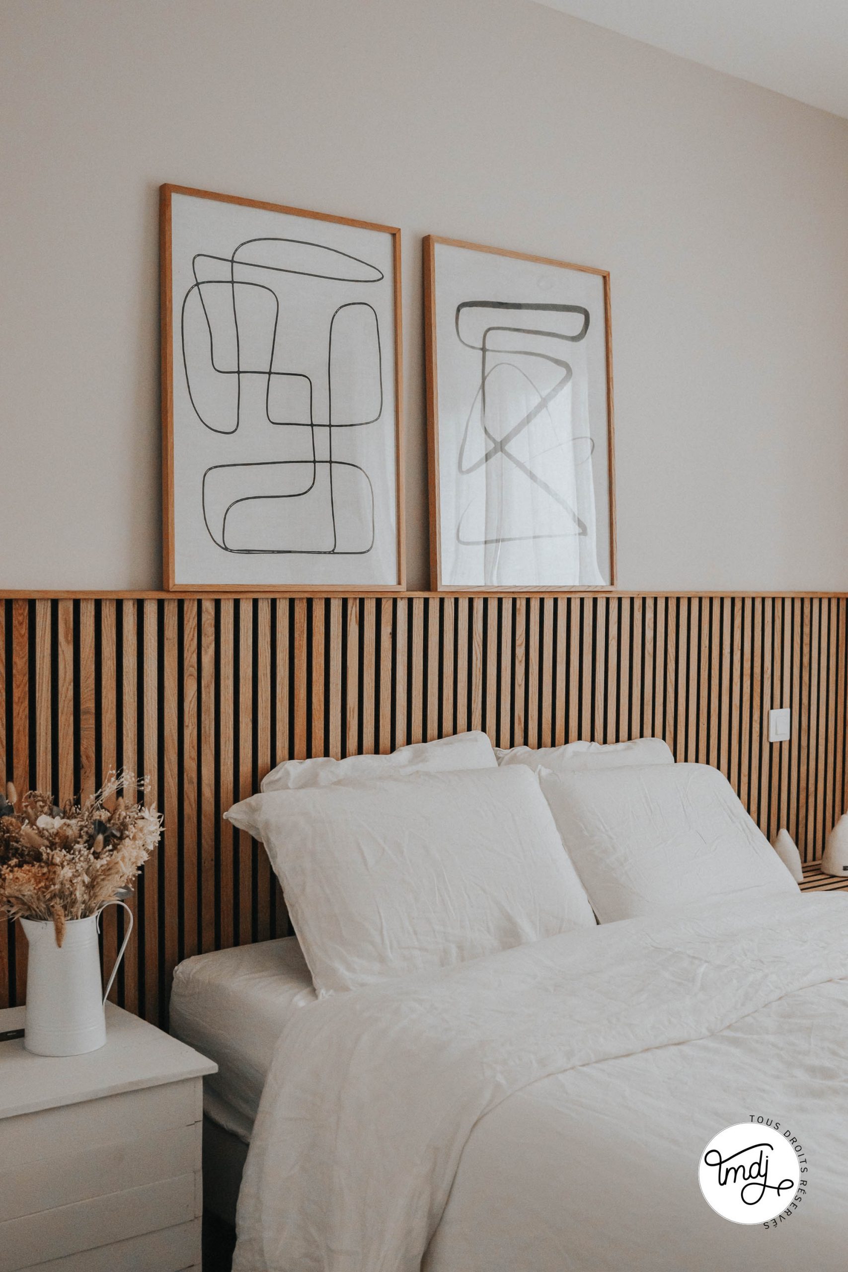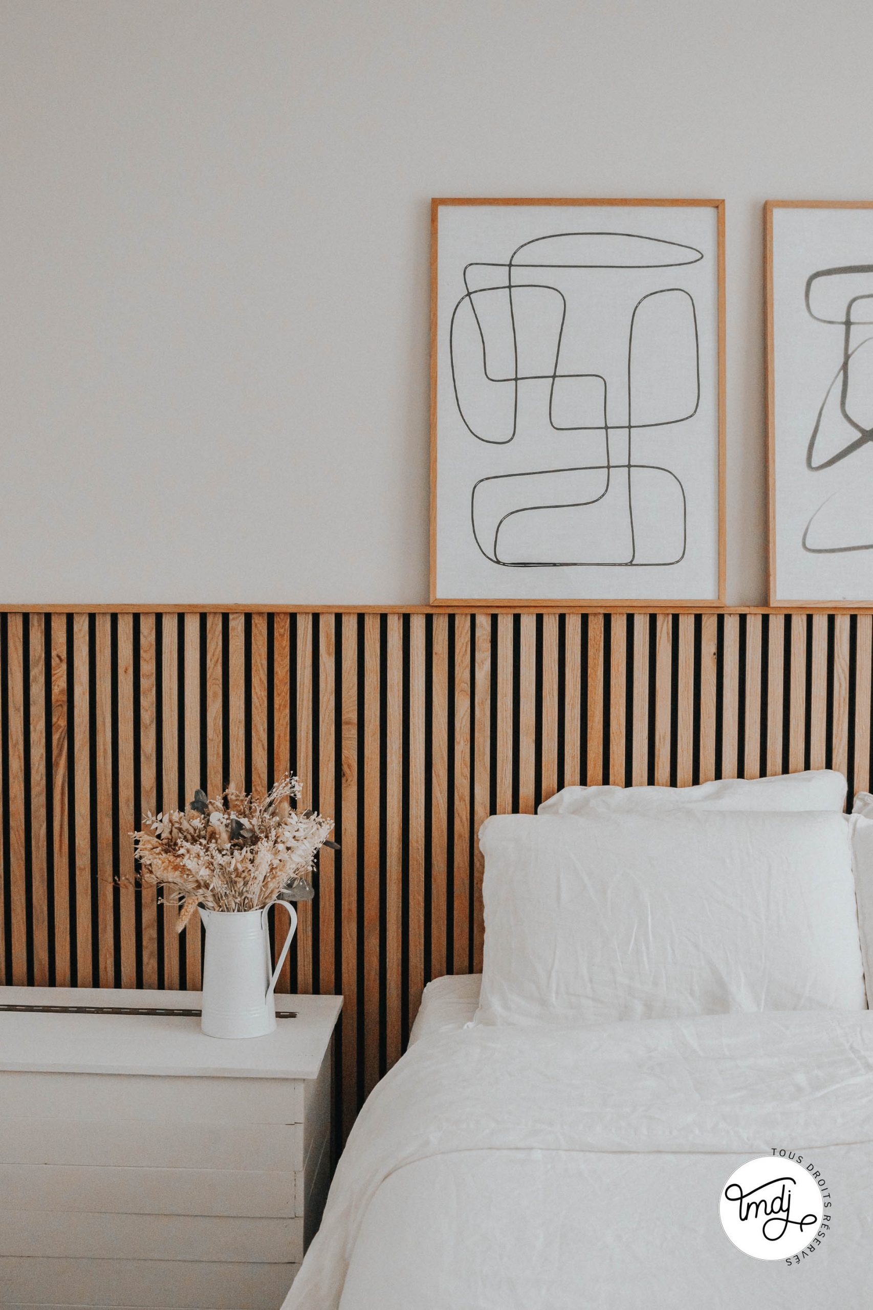 Produits offerts par la marque / Peinture IdParisDeco : Peinture ECO RESPECTUEUSE teinte : Craie – Produits offerts par la marque // LITERIE : L’incroyable Matelas Pelote Tediber / Sommier Tediber / Linge de lit Tediber // DÉCORATION : sur la table de chevet en tasseaux WoodUpp ⇒ cache-vases clochettes Muskane / Affiches Dear Sam : Soft Lines & Soft Lines 2 Produits offerts par la marque