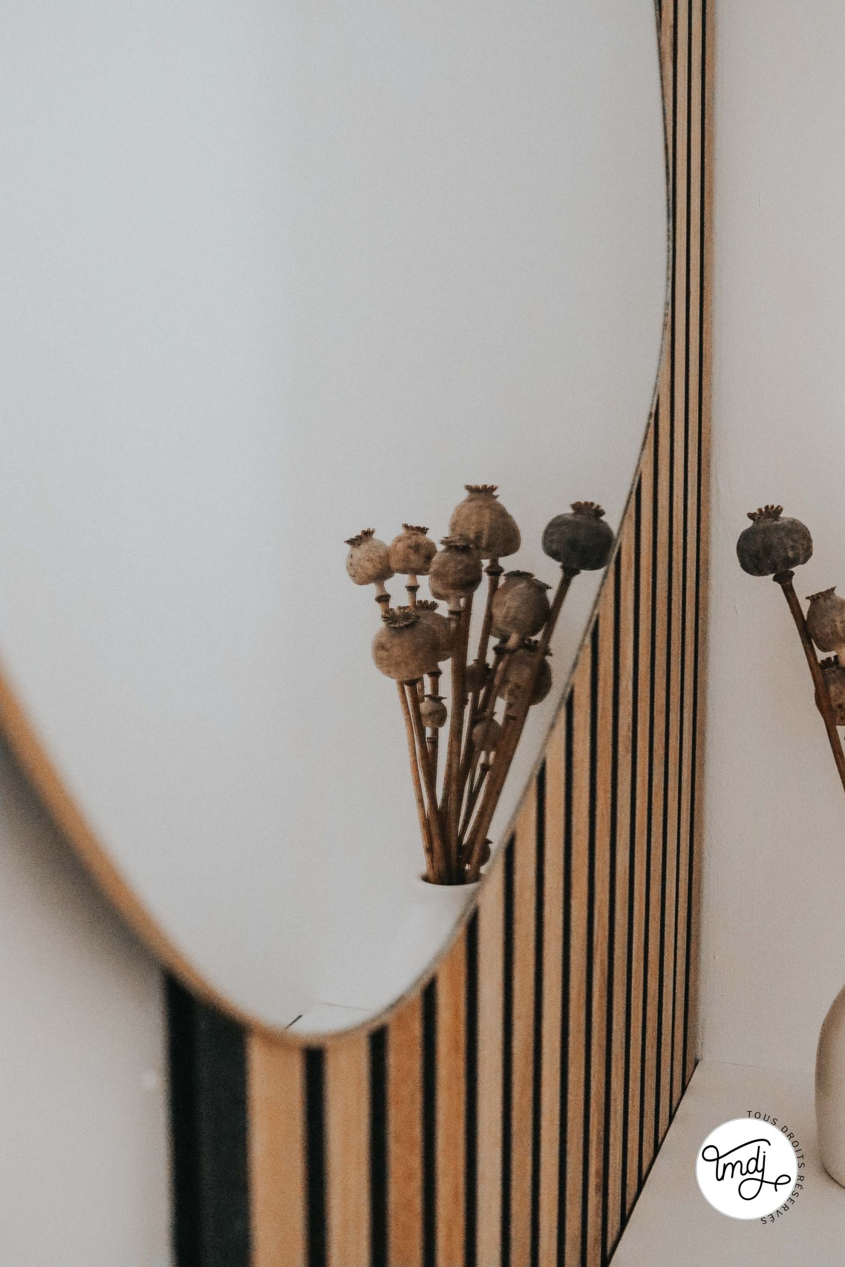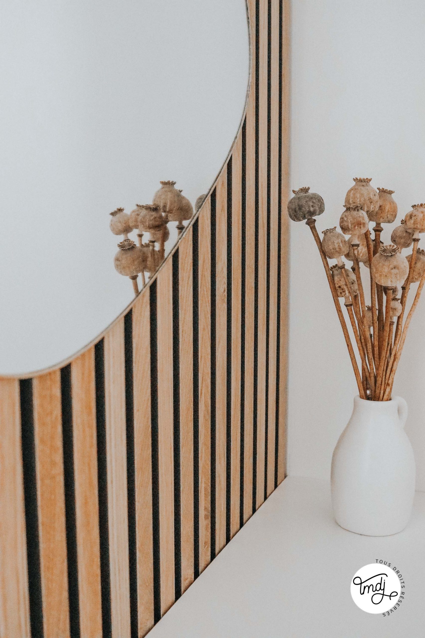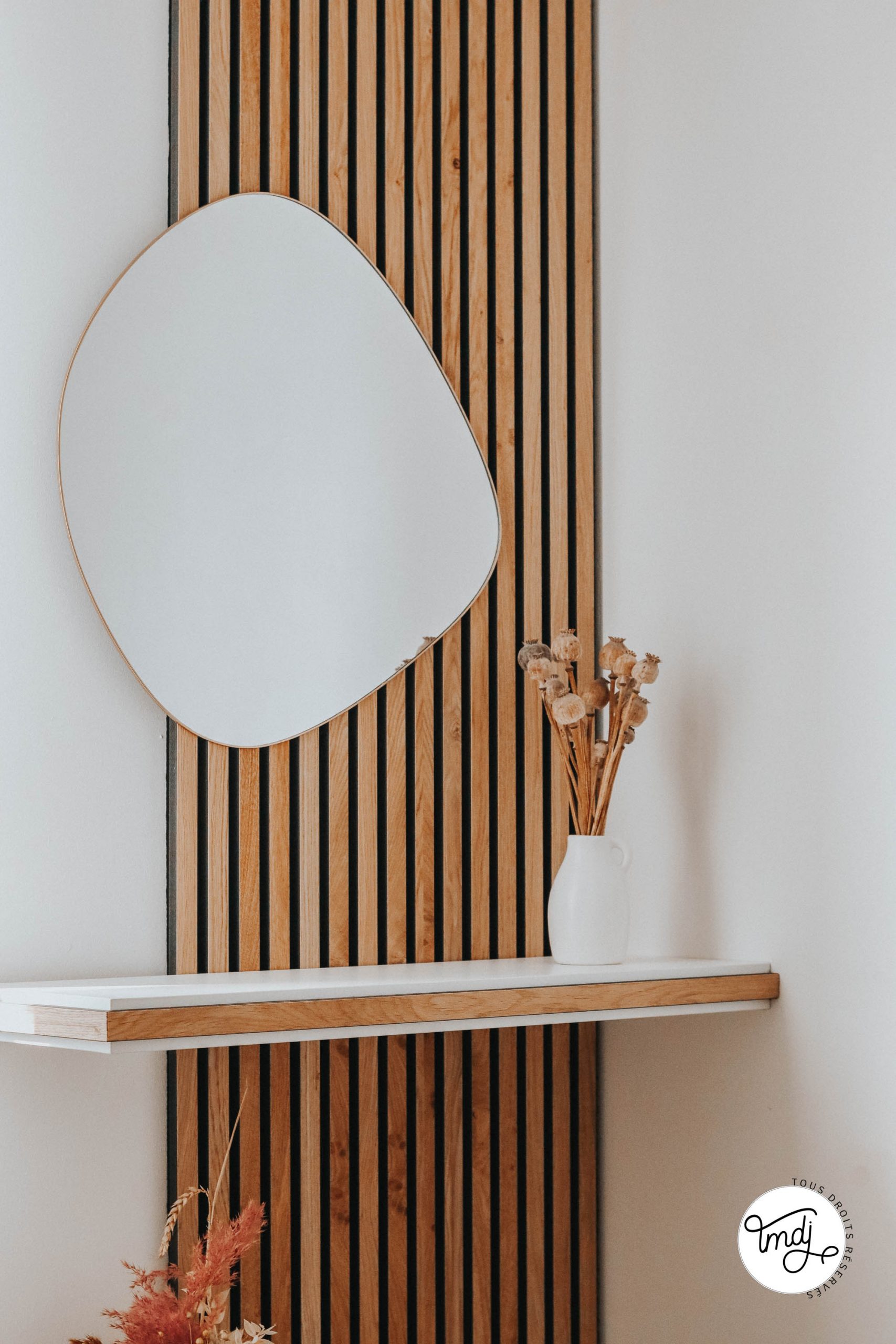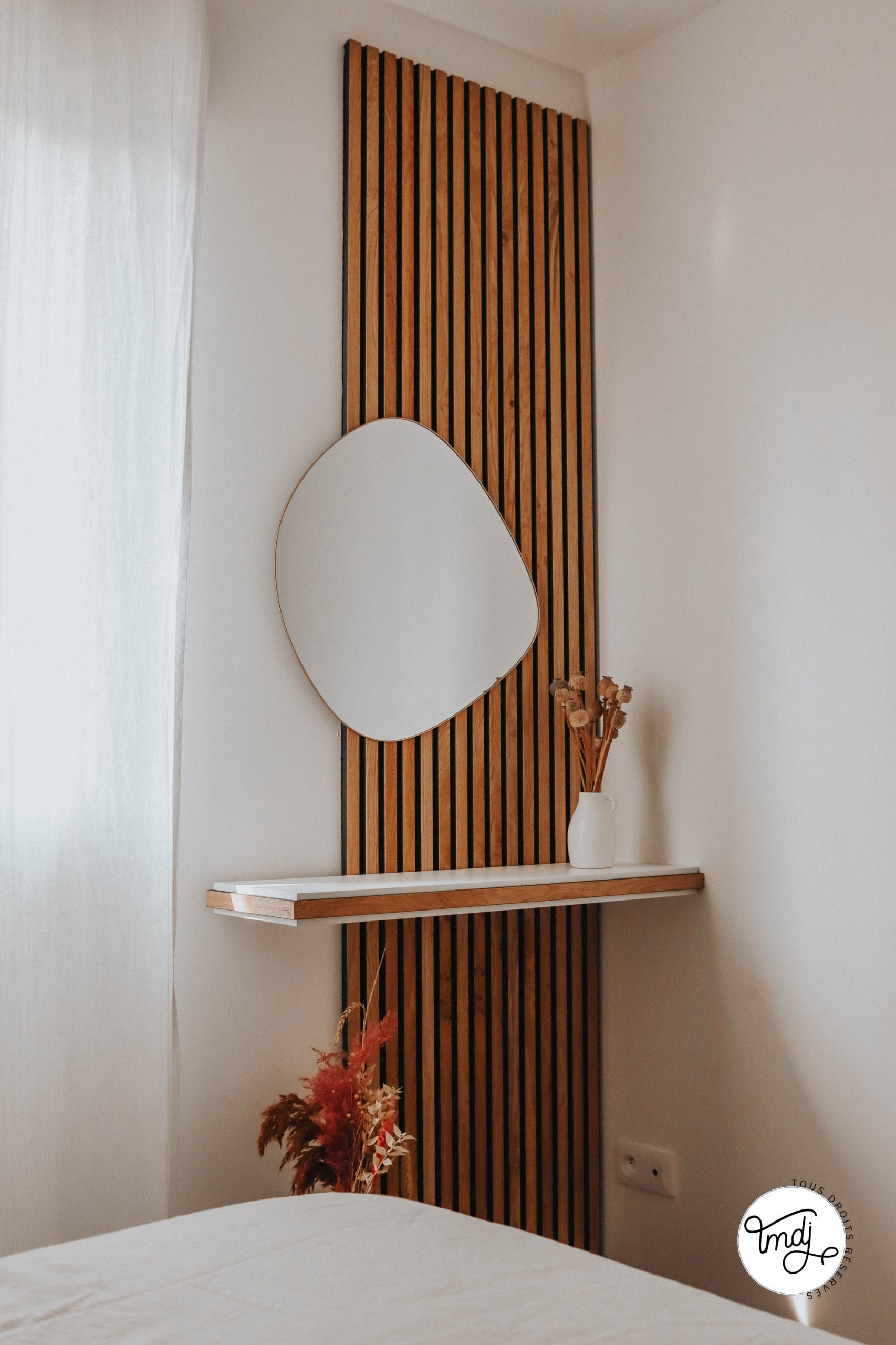 Produits offerts par la marque // MIROIR : ancienne co’ Sostrene Grene // ÉTAGÈRE : Ikea Hack avec étagère LACK + des chutes de panneaux en tasseaux WoodUpp.Du côté du lit