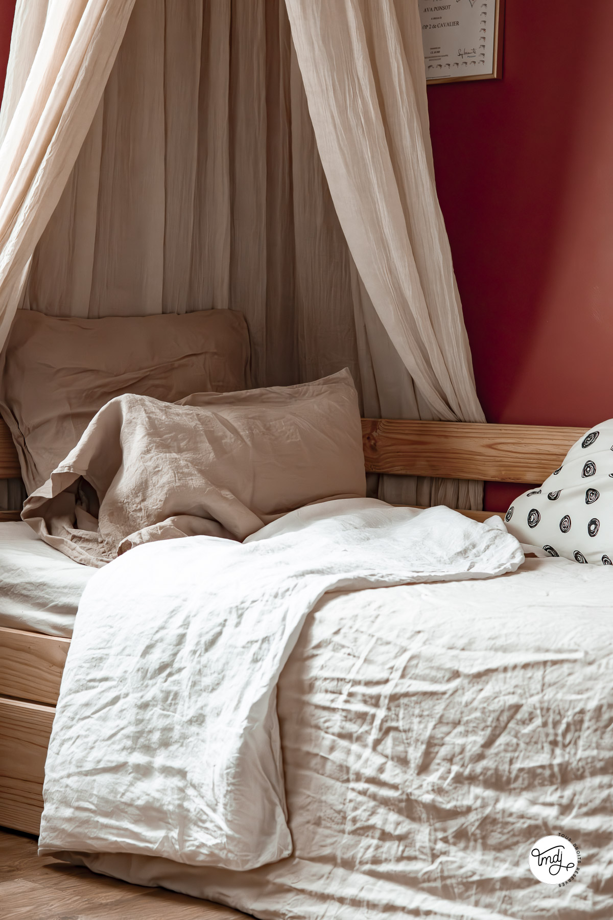 Jusqu’ici, je ne vois que des avantages à ce linge de lit, au choix des matériaux. Et pour les couleurs, je suis restée sur des teintes sobres et naturelles finalement (au départ, j’optais pour le terracotta de La Compagnie du Blanc et je me suis finalement résignée, parce que, comme ça, je peux passer ce linge de lit dans une autre chambre, si besoin). En vrai, le linge est encore plus beau qu’en photo.