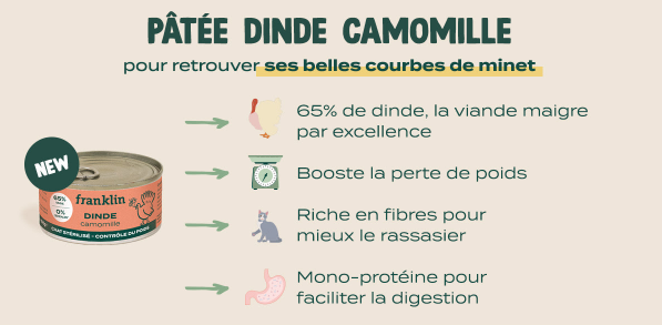La recette idéale pour les chats en surpoids (ou avec quelques rondeurs) ? La nouvelle pâtée à la dinde de Franklin Pet Food.