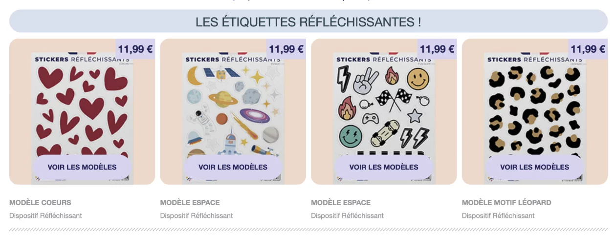 Ces stickers réfléchissants se déclinent en plusieurs versions pour s’adapter à tous les goûts et styles :