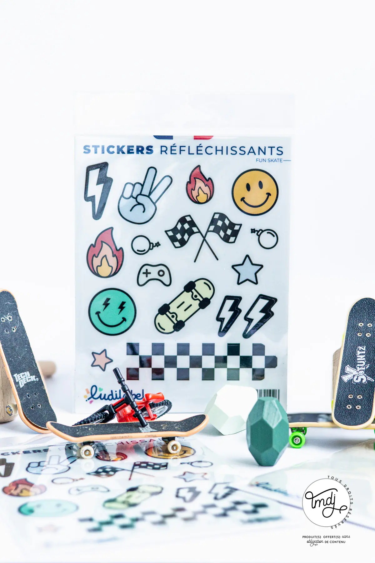 Ludilabel propose les Ludilights, de petits autocollants ingénieux, conçus pour apporter sécurité et visibilité aux enfants comme aux adultes dans l’obscurité. Ces stickers rétro-réfléchissants homologués Classe 1 se collent facilement sur les casques, cartables, poussettes, trottinettes et bien plus encore, garantissant une visibilité jusqu’à 100 mètres ! Ils réfléchissent la lumière des phares, alertant ainsi les conducteurs de voitures, camions et bus dès que la lumière faiblit.