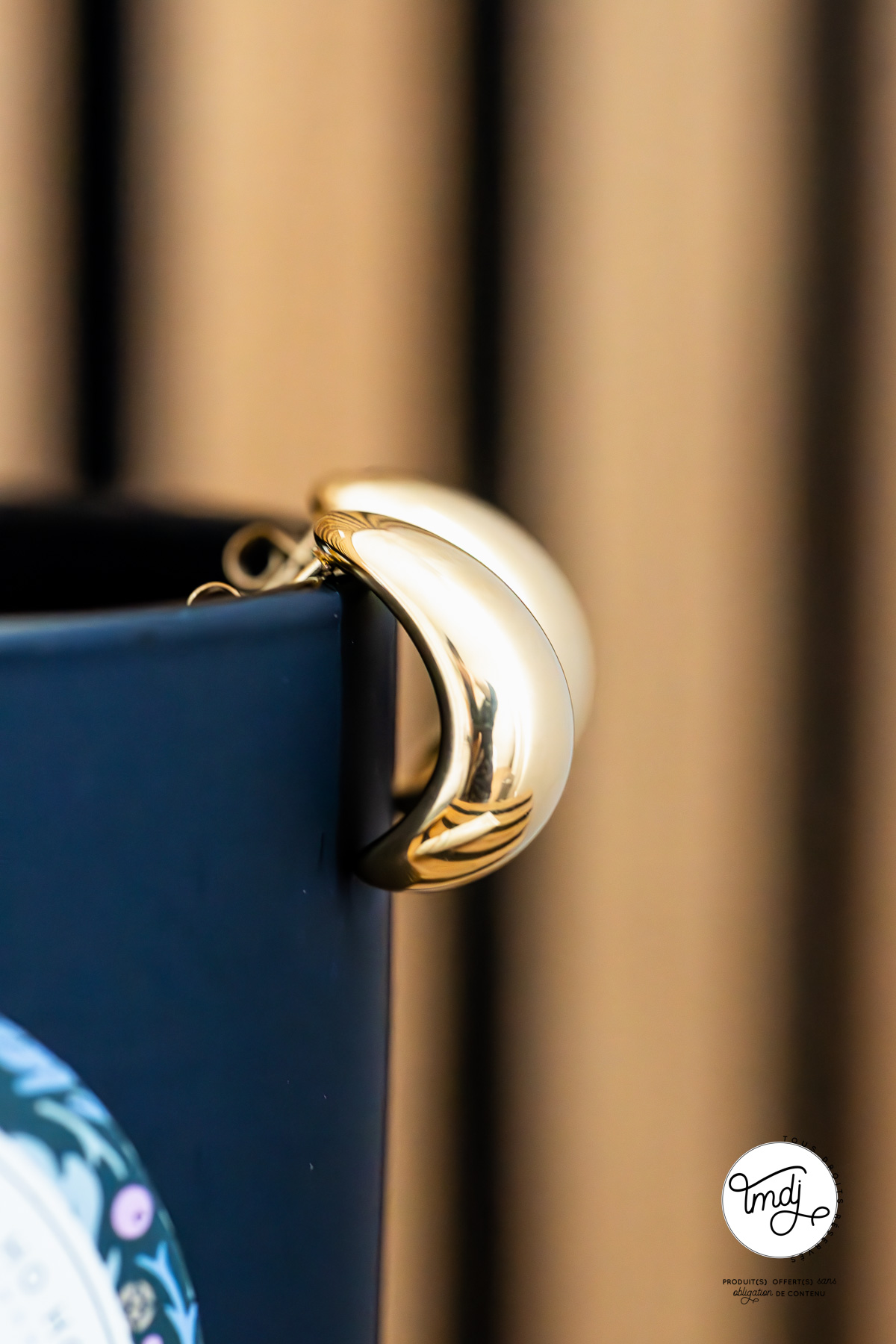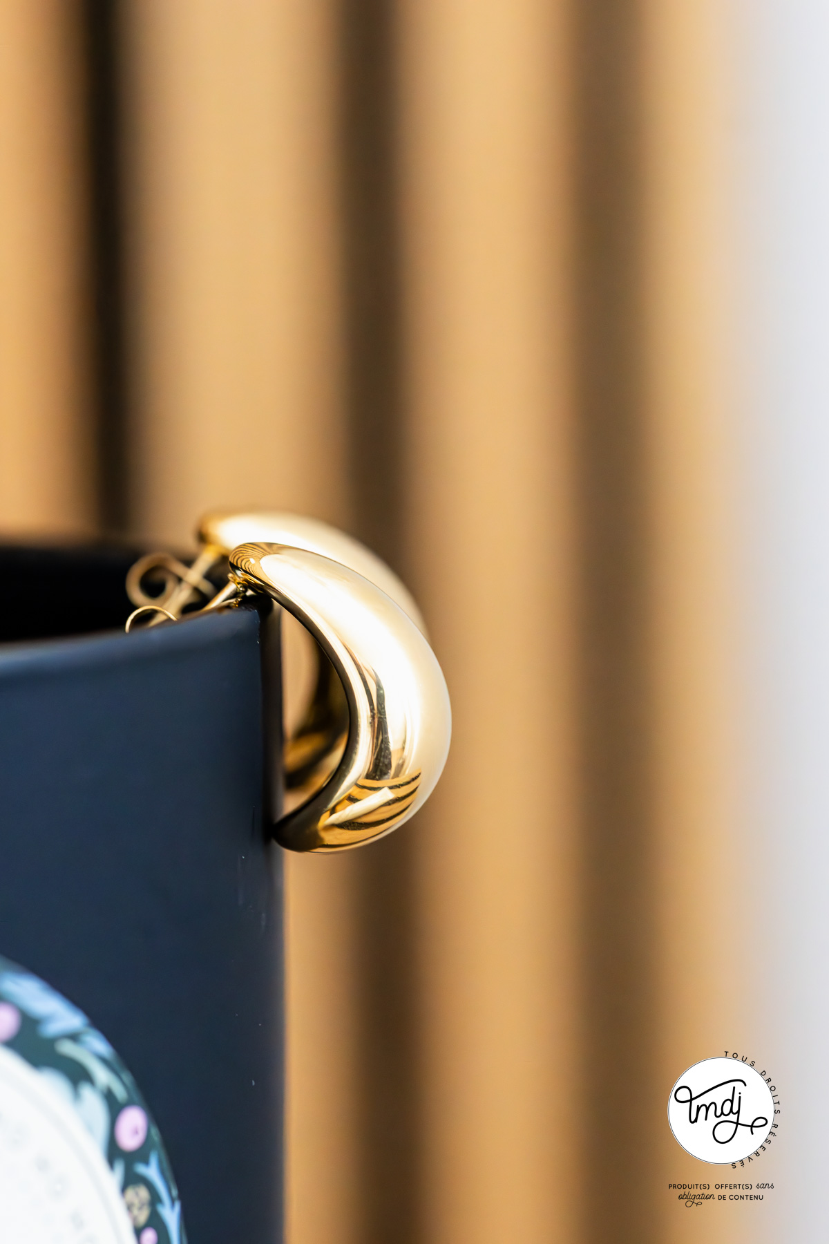 Cette paire de boucles d’oreilles en acier inoxydable doré, subtilement façonnées en forme de gouttes d’eau, apporteront une touche élégante et délicate à vos tenues de fin d’année. Idéales pour sublimer un look festif, elles reflètent l’esprit des fêtes avec discrétion et raffinement. Il est temps de se projeter et de commencer à imaginer la tenue parfaite pour célébrer cette période magique avec style.