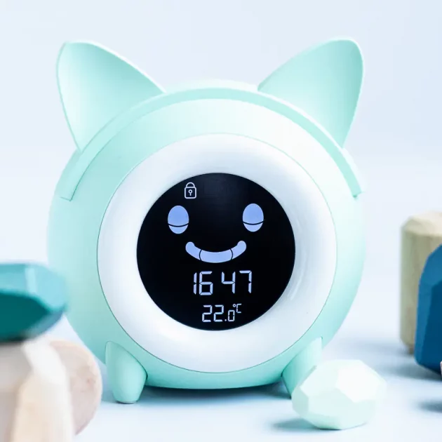 Le réveil utilise des expressions faciales et des jeux de lumières pour guider l’enfant dans ses routines matinales.