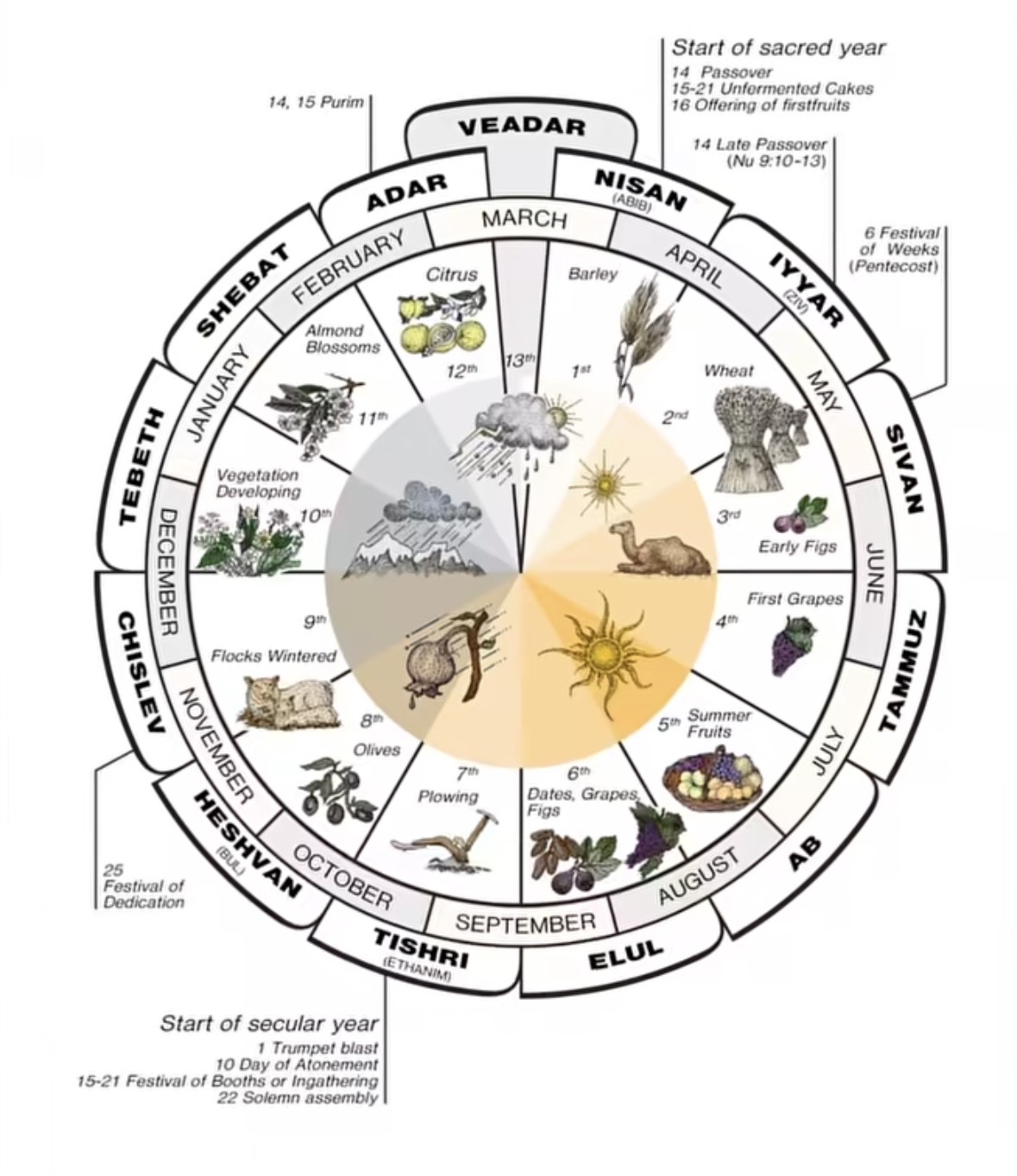 Schéma contemporain du calendrier hébraïque ancien, montrant l’organisation luni-solaire de l’année, les saisons agricoles, les récoltes et les fêtes traditionnelles. Une visualisation fidèle d’un temps pensé comme un cycle vivant, ajusté au ciel et à la terre.